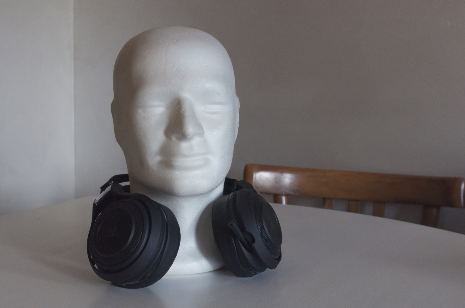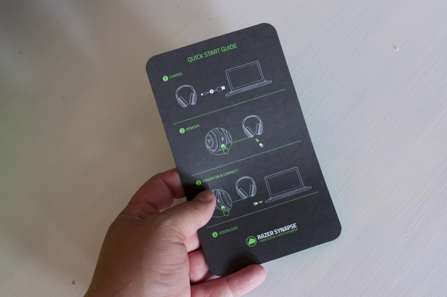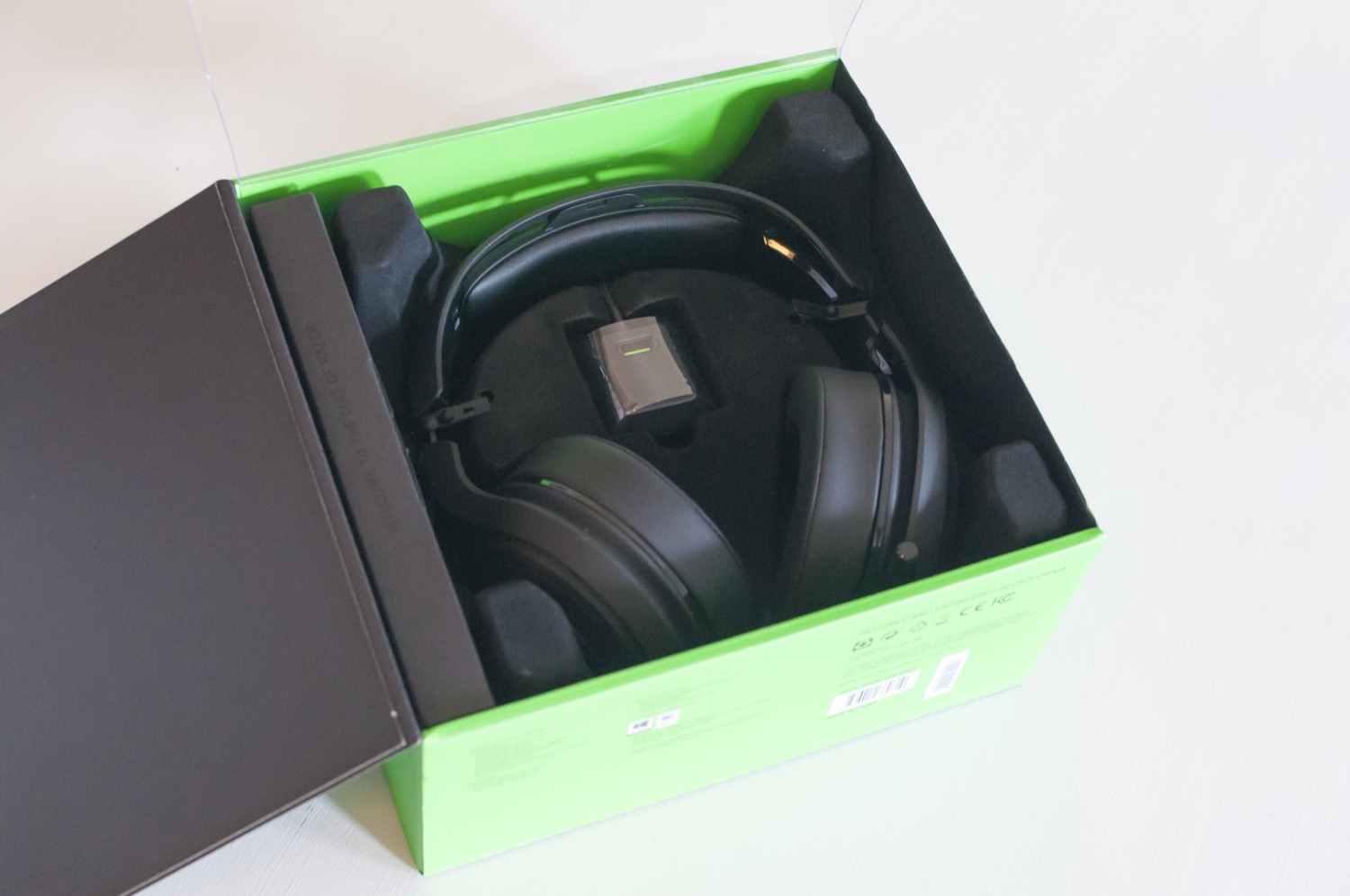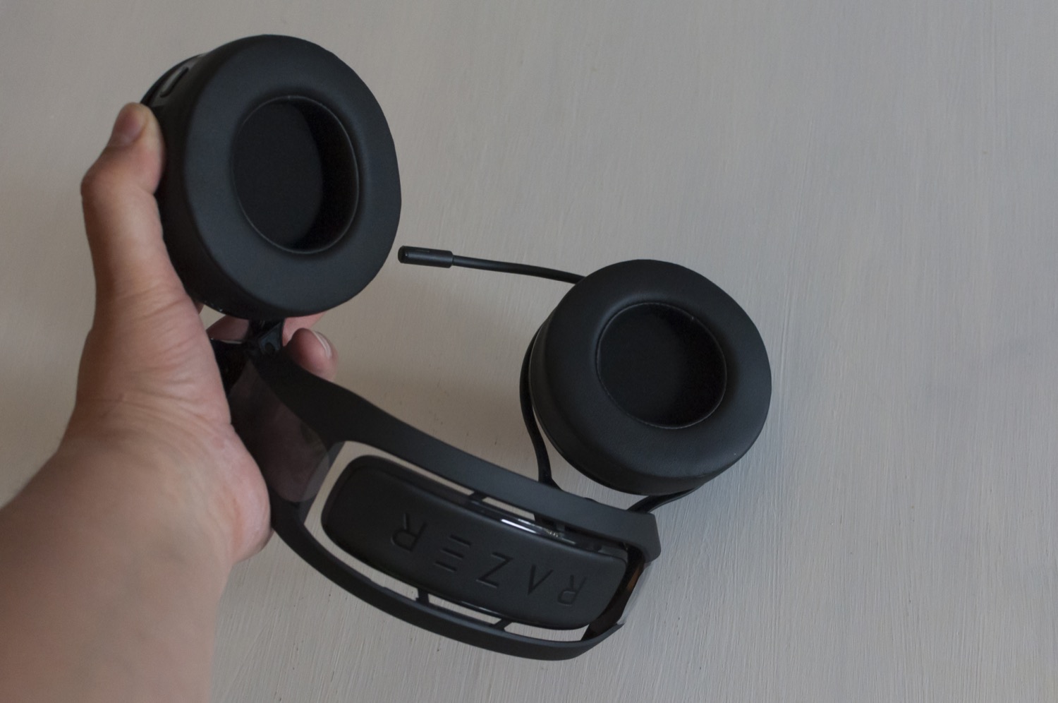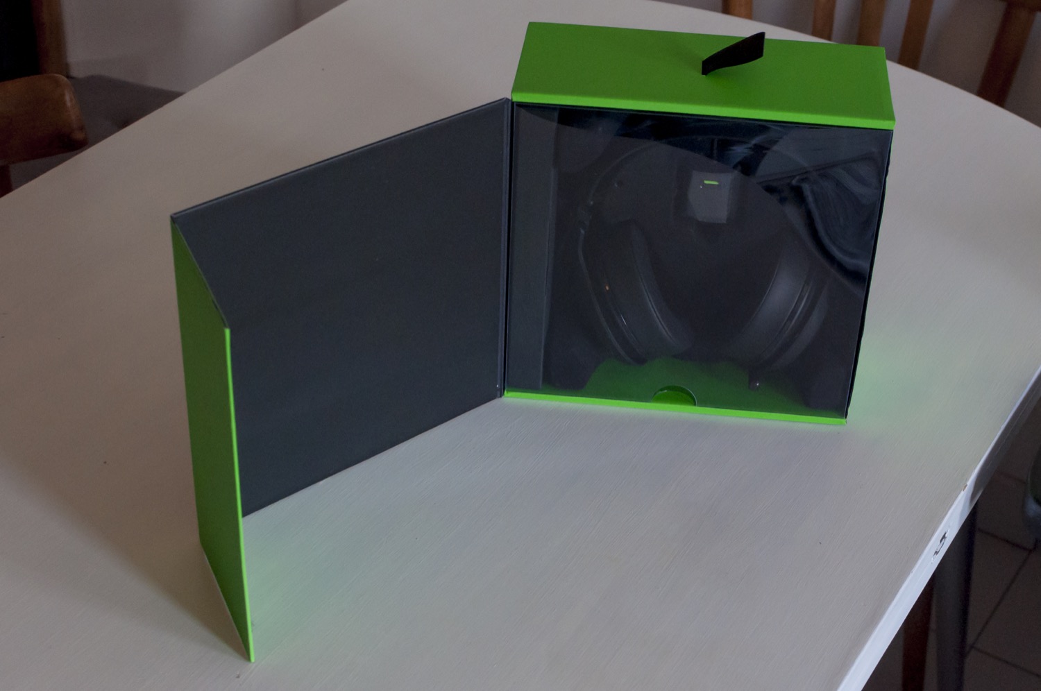 Le cuffie arrivano come sempre in una confezione molto bella: la semplicità del cartone è impreziosita dagli adesivi Razer e da uno strato di plastica trasparente che protegge le cuffie dalla polvere durante l’attesa in negozio. Una volta fuori il prodotto è molto bello: una fascia di plastica lucida è accompagnata da due opache, che accompagnano i padiglioni circumaurali, snodabili, dove una griglia racchiude il centro con il marchio Razer.