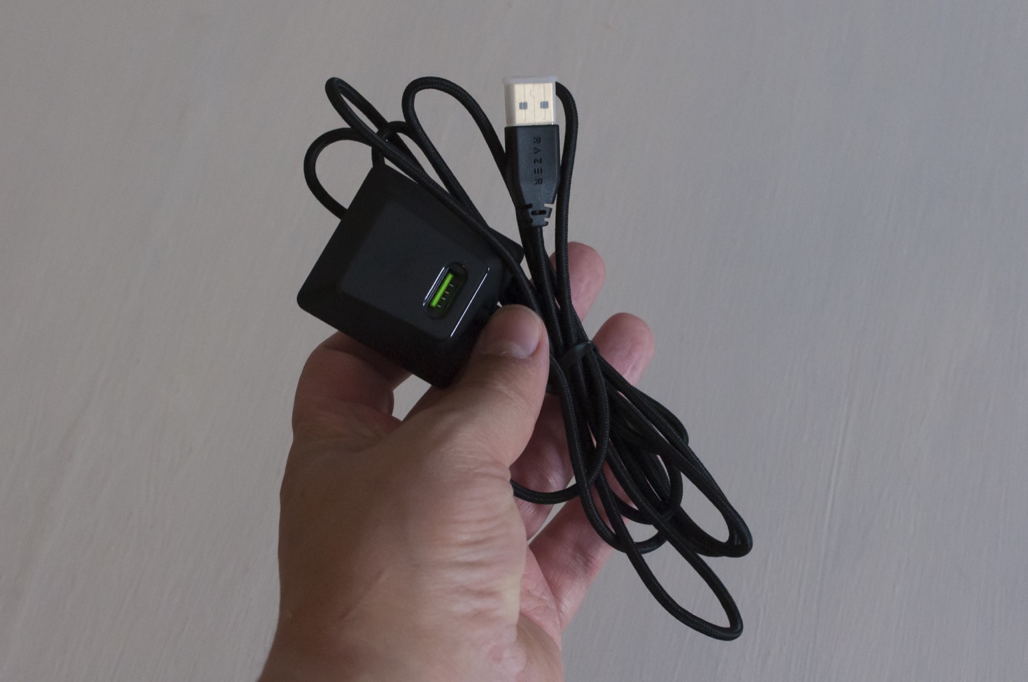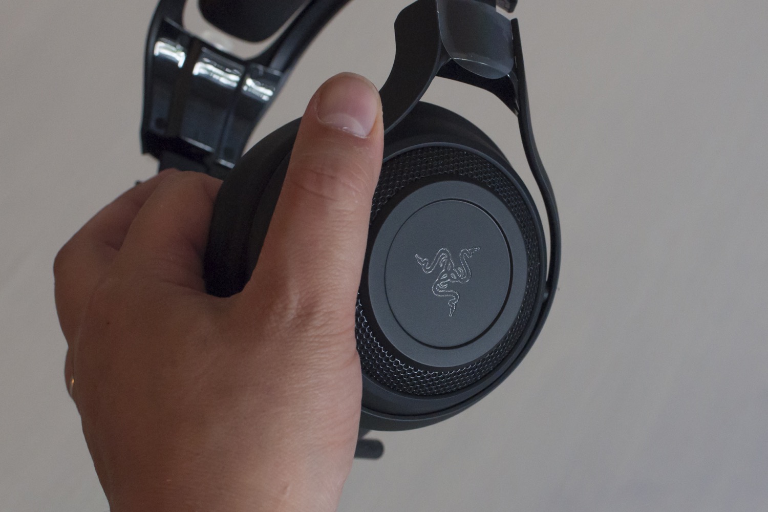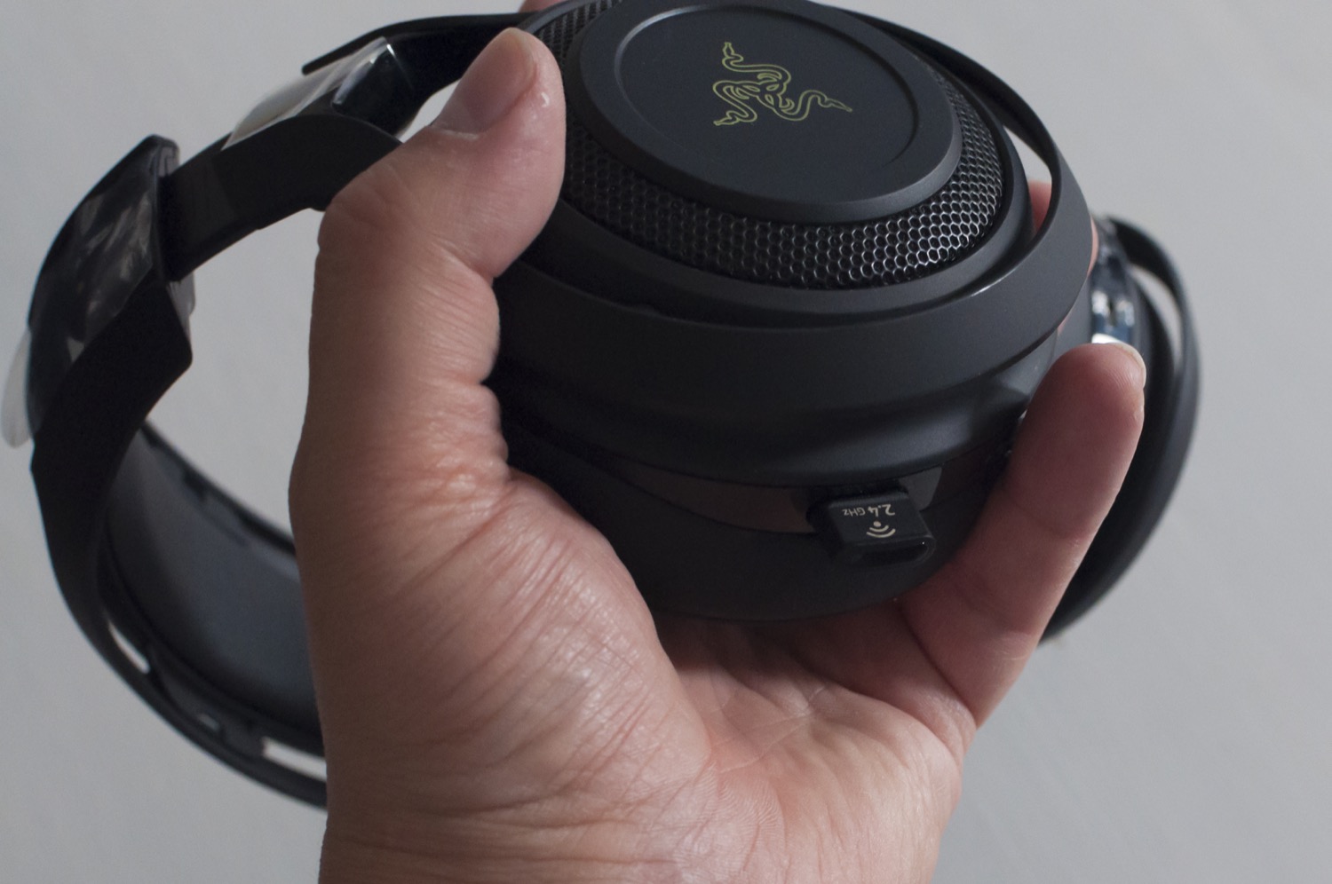 Sempre a destra trova posto il pulsante per l’accensione e lo spegnimento, che tra l’altro propone anche feedback sonoro in cuffia: a sinistra invece c’è l’alloggio dell’antenna USB, comodo per il trasporto. L’antenna, in pratica un piccolo dongle wireless, sostituisce sia il cavo analogico con jack che una connessione Bluetooth: una scelta molto importante da parte di Razer e ci sentiamo di condividerla, dopo averne valutato la resa.