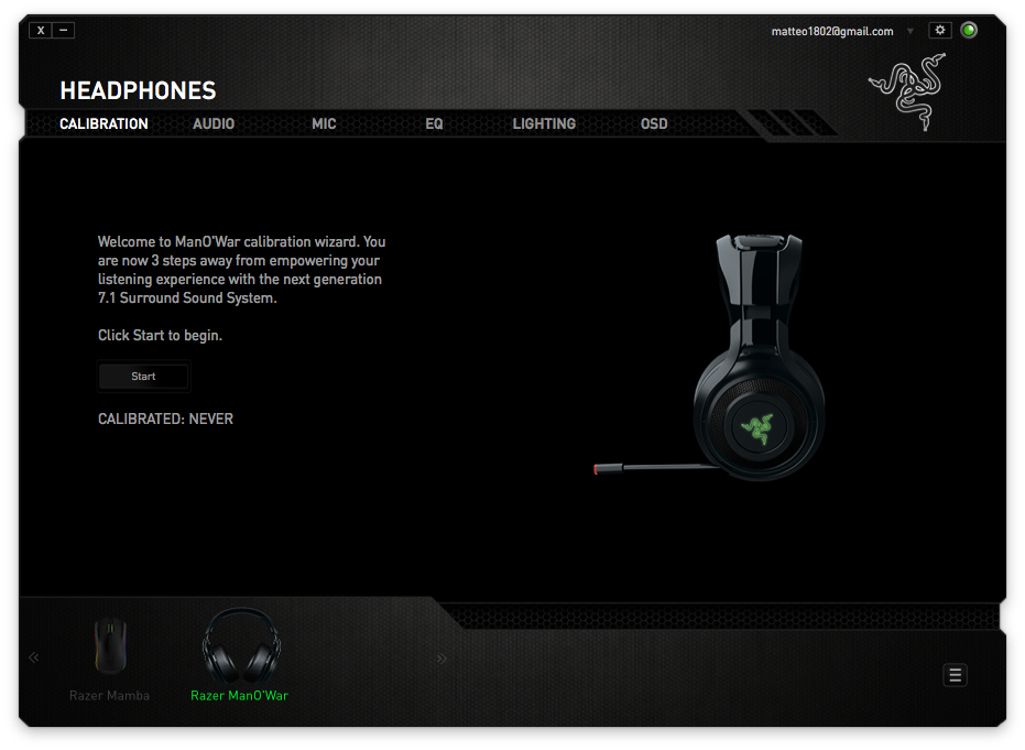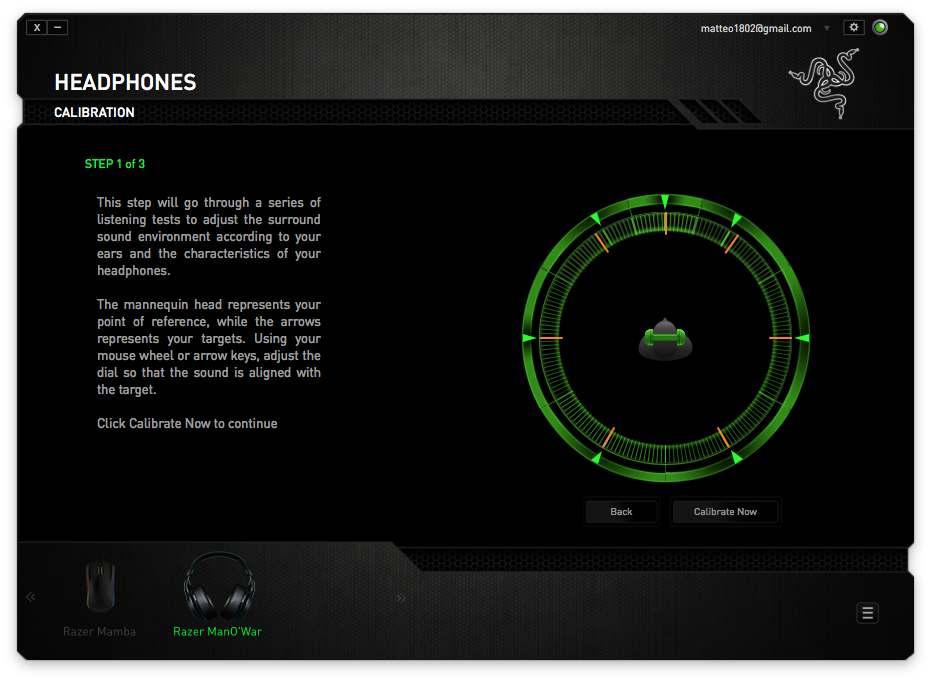 Diversamente da altri prodotti Razer, le cuffie funzionano a dovere anche senza aver installato i driver Synapse, che si scaricano gratuitamente dal sito: una volta aggiunto il dongle USB OS X ha visto subito la periferica (solo in stereo) e ci ha permesso di deliziarci del suono. Ma è con i driver che tutto inizia a funzionare a meraviglia: una volta installati questi hanno riconosciuto la periferica e chiesto un piccolo aggiornamento interno, dopodiché la prima schermata è dedicata alla fase di calibrazione dell’audio, che deve essere fatta singolarmente per ogni computer a cui le associamo (diversamente dagli altri set che invece si sincronizzano con il cloud).