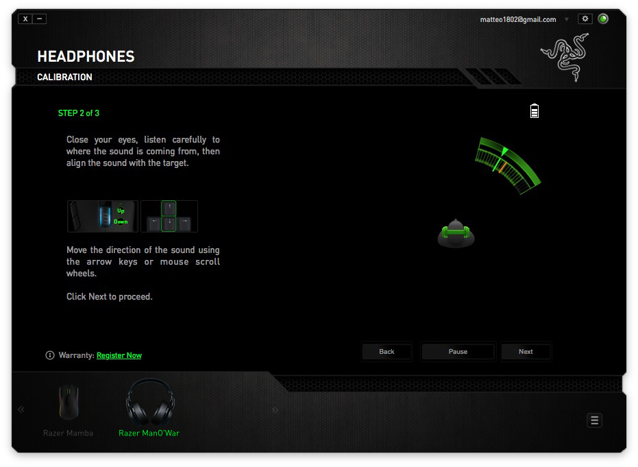 Le cuffie, lo ricordiamo, grazie ai driver Synapse permettono una simulazione dell’audio in modalità stereo e 7.1 (sempre che la sorgente lo permetta): già in fase di calibrazione la simulazione offre un impatto interessante, non certo come un sistema reale ma dato che si tratta di un paio di cuffie di sicuro sorprendente.