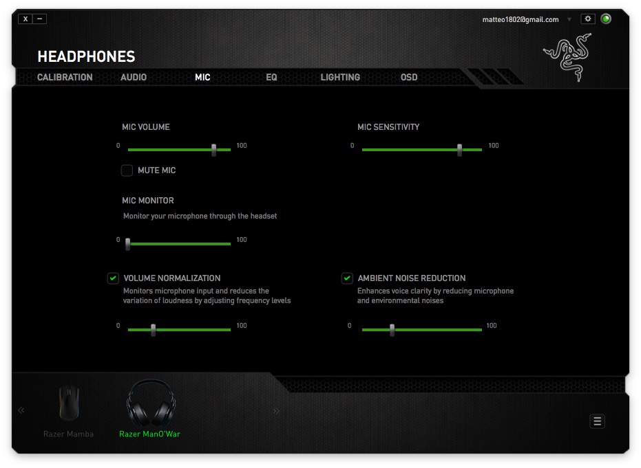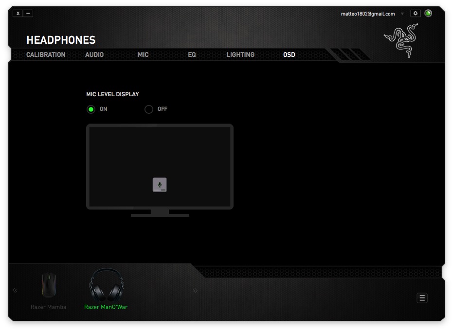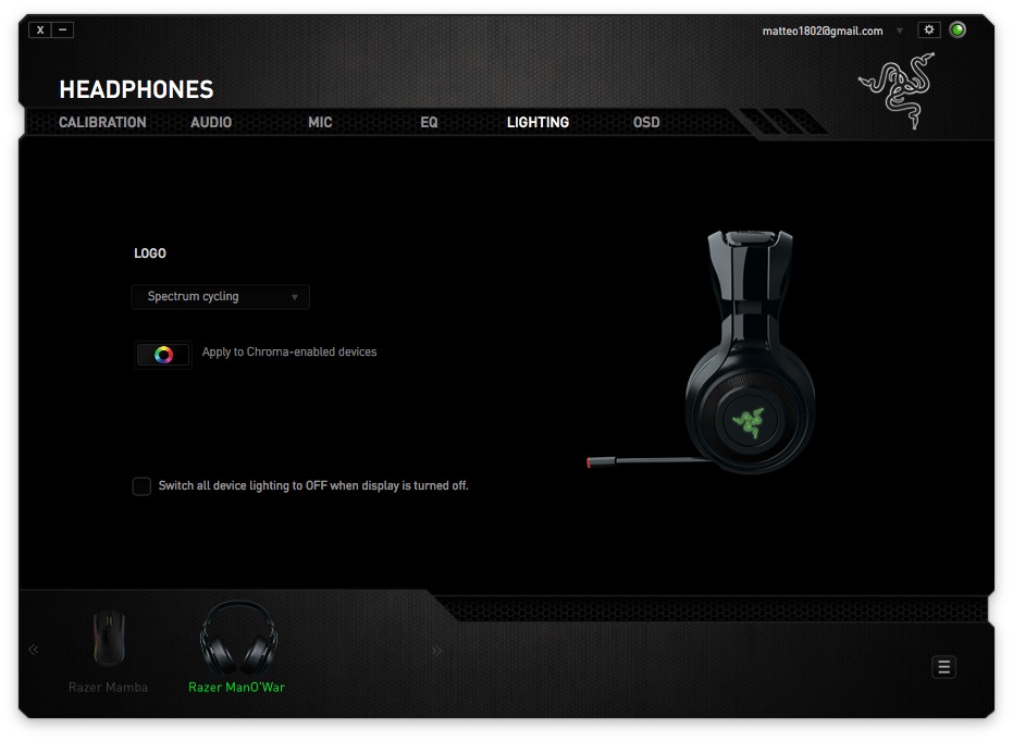Synapse permette anche di controllare l’illuminazione presente nel marchio Razer dei padiglioni tramite tre set diversi (più un quarto, spento): ciclo colori, due colori distinti oppure uno fisso, a piacere, offrono un effetto davvero importante specie al buio e specie se avete già altri device Razer come mouse o tastiere. che è possibile sincronizzare.