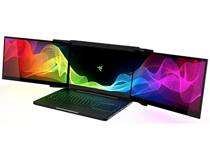 Ancora non si sa molto di questo computer, dato che Razer ha svelato l’anteprima al CES di Las Vegas: dal video e dalle foto ufficiali possiamo vedere come il meccanismo dei tre display riesce, in modo del tutto autonomo, a chiudersi all’interno del case, limitando l’ingombro a quello di un normale Laptop da 17″. Il materiale costruttivo in lega di alluminio poi dovrebbe garantire un peso relativamente importante, e anche lo spessore, grazie all’incavo per i display, non dovrebbe superare quello dei più comuni laptop da gioco in commercio, attestandosi più o meno al doppio di un Razer Blade (che è appena più spesso dei nuovi MacBook Pro).
