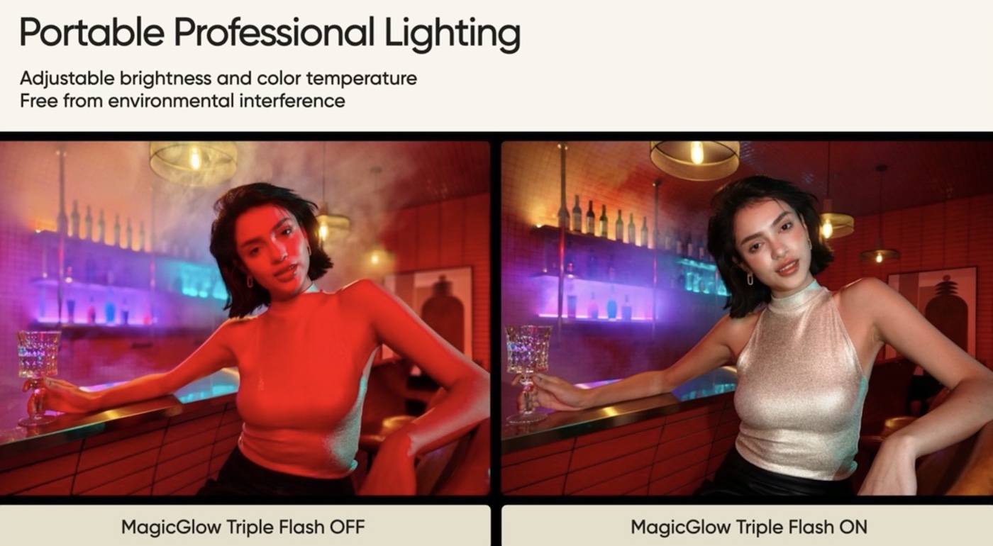 Quando le luci si abbassano e inizia la festa, il primo flash triplo “MagicGlow” al mondo si trasforma in un sistema di illuminazione personale. Il sistema fornisce un’illuminazione su tre direzioni – frontale, laterale e di riempimento ambientale – ricreando condizioni di illuminazione da studio in ambienti poco illuminati. Inoltre, è possibile selezionare le impostazioni di illuminazione e temperatura del colore per soddisfare ogni esigenza.