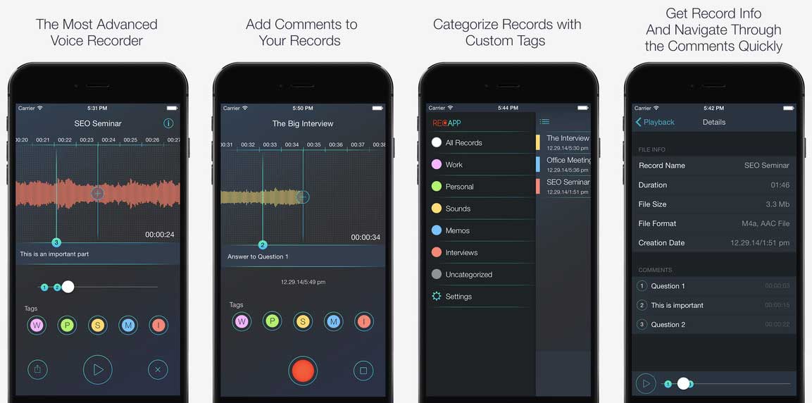 RecApp è una nuova app per iOS che può essere sfruttata alla stregua di un voice recorder e con funzionalità che potrebbero essere utili per giornalisti, blogger, musicisti e studenti. A detta degli sviluppatori l’app è stata creata dopo aver sentito le necessità di persone che hanno questo tipo di necessità, e grazie a queste sono state implementate funzionalità quali: la possibilità di aggiungere commenti alle registrazioni, condividere le registrazioni e i commenti, sfruttare tag per le tracce, aprire file da sistemi di cloud storage, importare/esportare su iTunes, la disponibilità di un widget specifico per iOS 8, funzioni di condivisione verso SoundCloud. L’aspetto dell’app può essere cambiato con un tema “Light” o “Dark”.