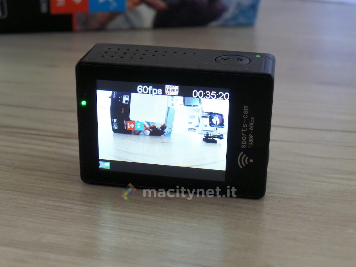 Lo stesso pulsante Wi-Fi permette di accedere al menù impostazioni, all’interno del quale poter impostare la risoluzione video, abilitare/disabilitare la stabilizzazione dell’immagine, attivare Low Loght Mode, o scegliere il bilanciamento dei bianchi tra automatico, giornata di sole, giornata nuvolosa o luce artificiale. Lo stesso menù, inoltre, permette di cambiare lingua alla cam (l’italiano è incluso, anche se non tradotto perfettamente), attivare il risparmio energetico, impostando il timer per far spegnere automaticamente la cam, e altre impostazioni ancora, come quella che permette di invertire l’orientamento del filmato, in caso si volesse disporre la cam a testa in giù. Sulla parte alta, invece, il pulsante di scatto.