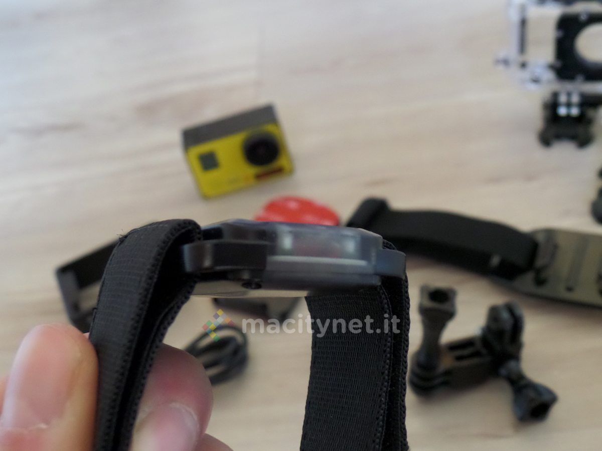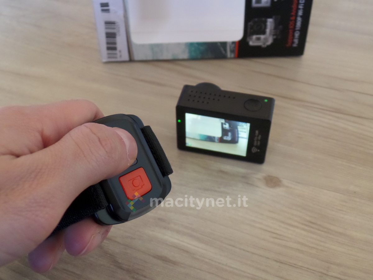 Inclusa nella confezione di vendita anche una sorta di smartband, o di telecomando, che permette di scattare video e avviare registrazioni con gli appositi tasti dedicati. Funziona tramite tecnologia IR, ragion per la quale occorre spesso direzionare con precisione il telecomando verso la telecamera prima che questa percepisca il comando. Tenendo a mente questa piccola accortezza si riesce a sfruttare a dovere l’accessorio: nel caso in cui la camera si posta su un casco occorre alzare leggermente il polso e indirizzarlo verso la camera per poter avviare video o scattare foto.