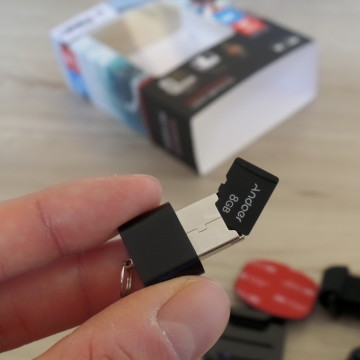 Mai come in questa recensione è doveroso porre l’accento sul contenuto del bundle di vendita, che probabilmente giustifica proprio il prezzo di una novantina di euro; oltre alla cam, infatti, la confezione contiene anche la cover subacquea, una smartband per scattare foto e avviare video con un semplice tasto direttamente dal polso, nonché numerosi accessori per fissare la cam sul casco, per attaccarla al corpo o per fissarla in supporti vari. E’ presente anche un supporto in plastica, grazie al quale riparare leggermente la cam e fissarla su cruscotti di autoveicoli o in mille altre posizioni. Nella nostra confezione era, inoltre, è anche presente una micro SD da 8GB, marchiata Andoer, oltre ad un piccolo adattatore USB, a forma di tradizionale chiavetta, per poter leggere la MicroSD in un qualsiasi MAC/PC, desktop o portatile; questi accessori, è bene dirlo, potrebbero non essere presenti in altri pacchetti.