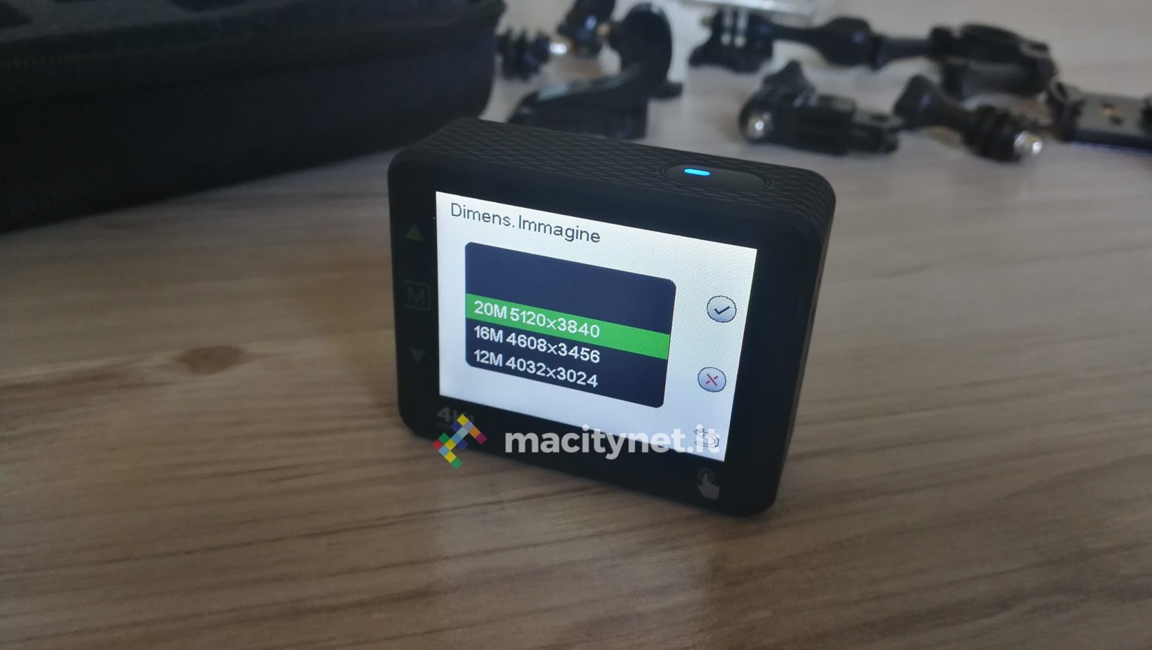 Sulla parte posteriore è presente un ampio display da 2,31 pollici, con tecnologia LCD, che permette di navigare l’interfaccia della camera in modo preciso, comodo e intuitivo. Si tratta di un valore aggiunte per action cam su questa fascia di prezzo. Sempre reattivo permette di esplorare i numerosi menù disponibili, che altrimenti sarebbe stato scomodo gestire dai tasti fisici presenti ai lati della camera. Ovviamente, quando inserita all’interno del case subacqueo si perde questa funzionalità, potendo comunque gestire l’intera camera dai tasti presenti sulla plastica dello scafandro.