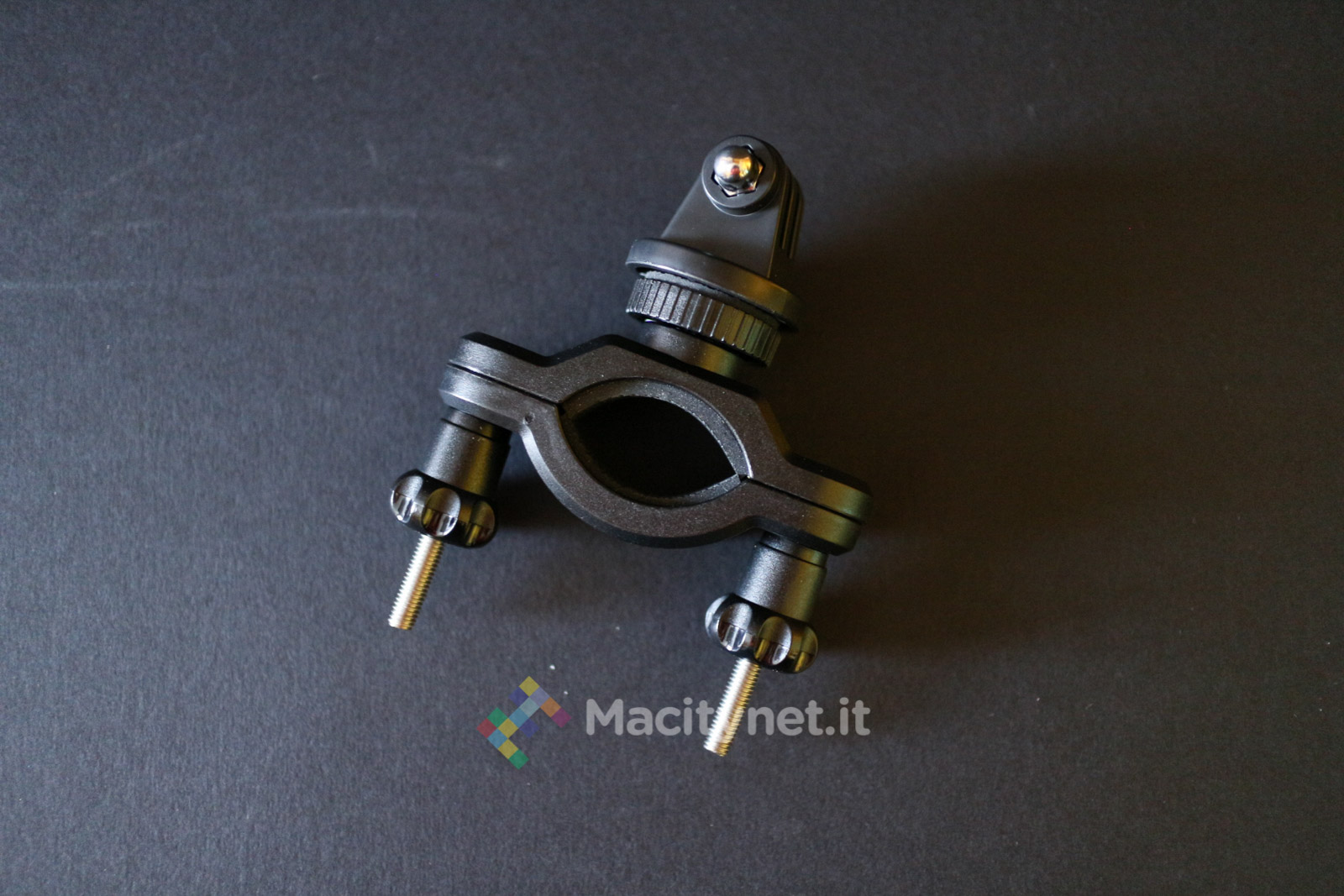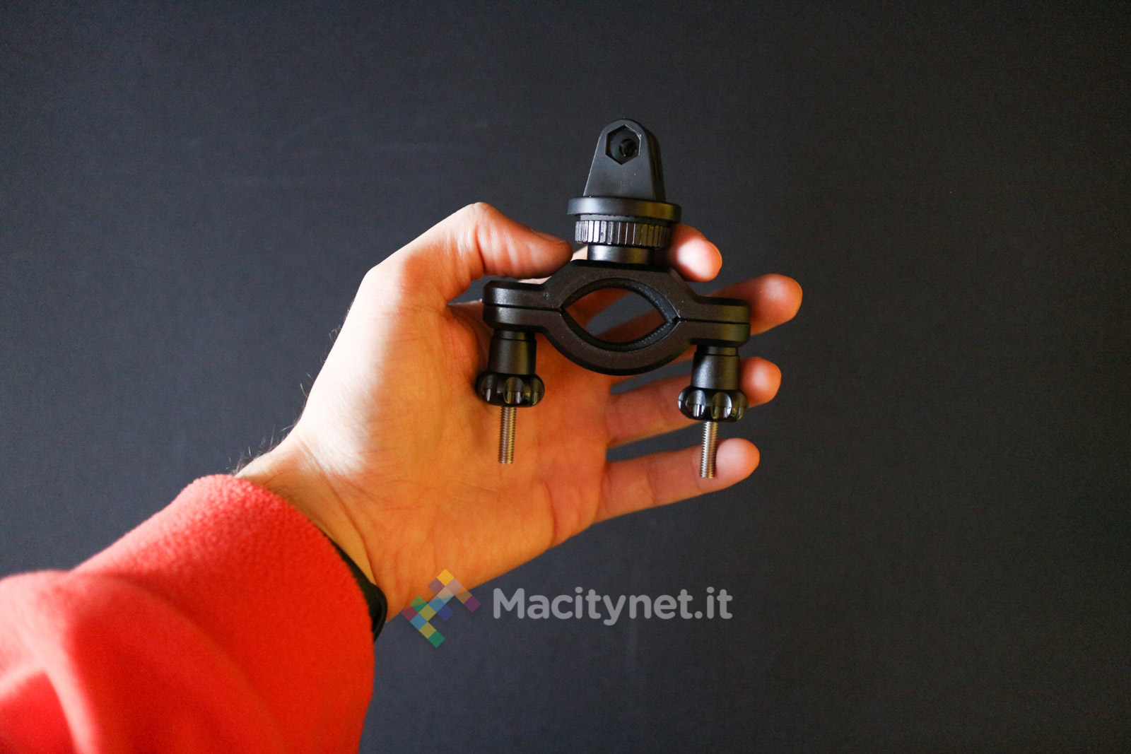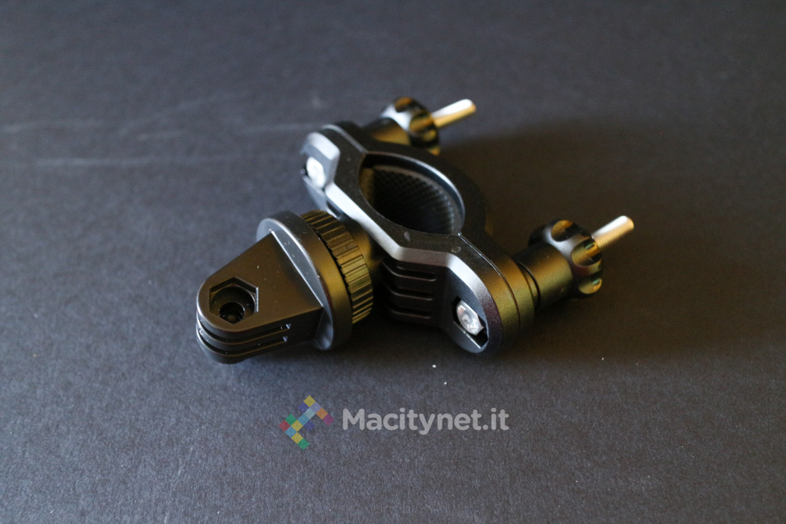 Sono entrambi in plastica di buona qualità, inoltre il roll bar mount incorpora dei supporti interni in gomma che aumentano l’aderenza su tubi e superfici liscie. Un’altra differenza che abbiamo apprezzato rispetto ad altri supporti simili che abbiamo trovato invece inclusi nella confezione di action camere di altri produttori è la disposizione inversa del sistema di bloccaggio a vite. I morsetti si trovano infatti dal lato opposto, una scelta che riduce l’ingombro generale del supporto e ne rende più semplice il fissaggio.