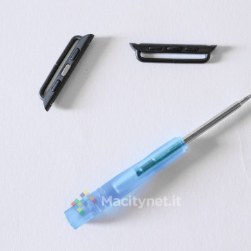 Le viti, due per ciascun adattatore, si trovano nella parte interna della fibbia, saranno quindi coperte e protette quando si agganceranno alla cassa di Apple Watch, senza così “sporcare” il design lineare dell’orologio. E’ sufficiente allentarle con il cacciavite incluso nella confezione per poter separare i due componenti tubolari che dovranno essere infilati nel classico foro del cinturino, che negli orologi tradizionali è occupato da una sottile asta a molla.