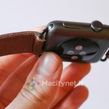 Ambo i lati di ciascuna fibbia troviamo due gommini, gli stessi che incorporano anche i cinturini originali Apple e che evitano di graffiare la cassa con il continuo aggancio-sgancio dei bracciali. Al centro c’è lo stesso meccanismo pin-and-tuck ideato da Apple che collabora proprio con il pulsante della cassa di Apple Watch per la rimozione ed il bloccaggio di ciascun cinturino.