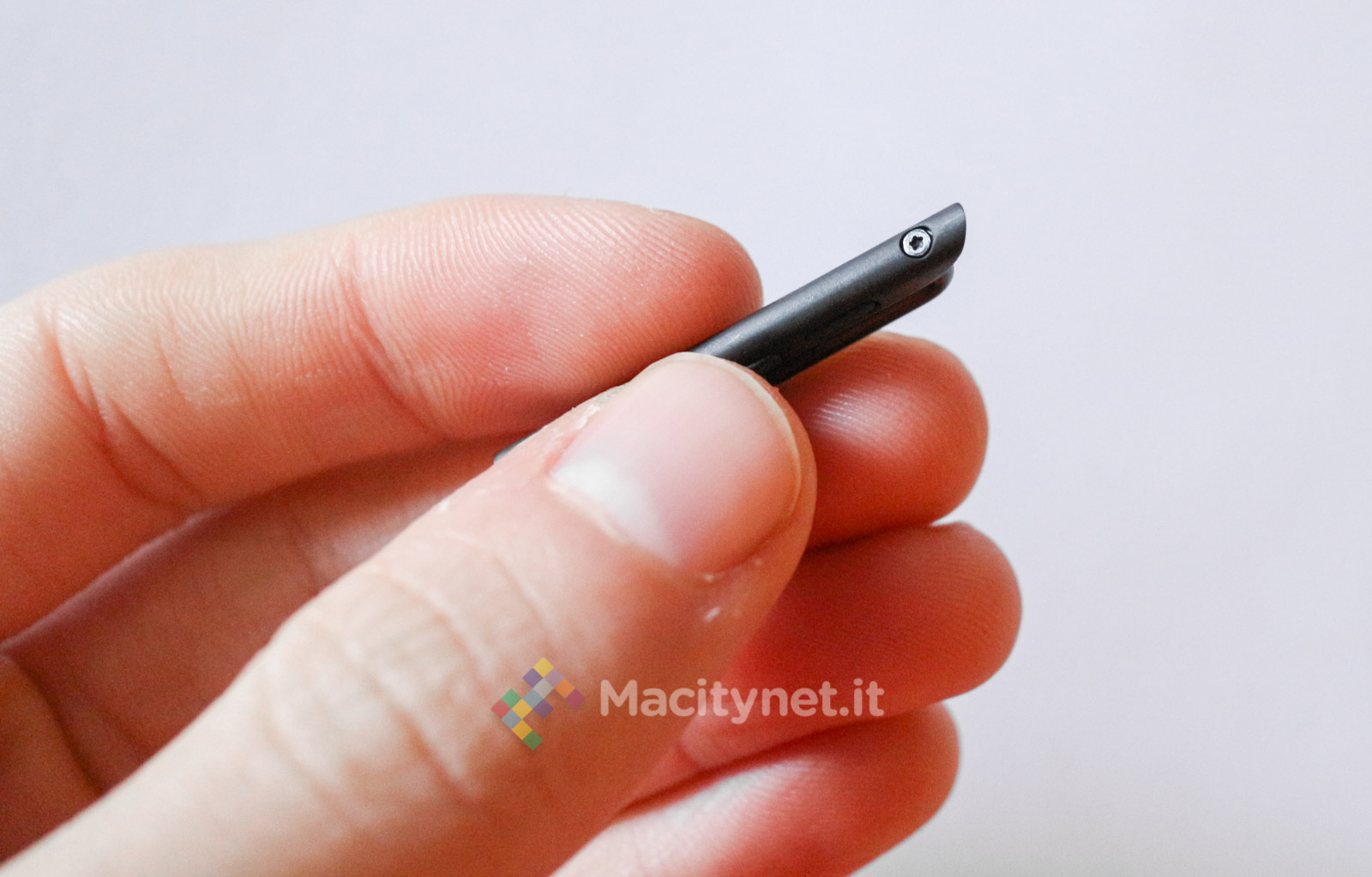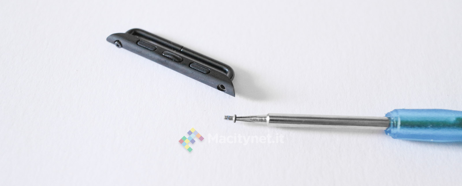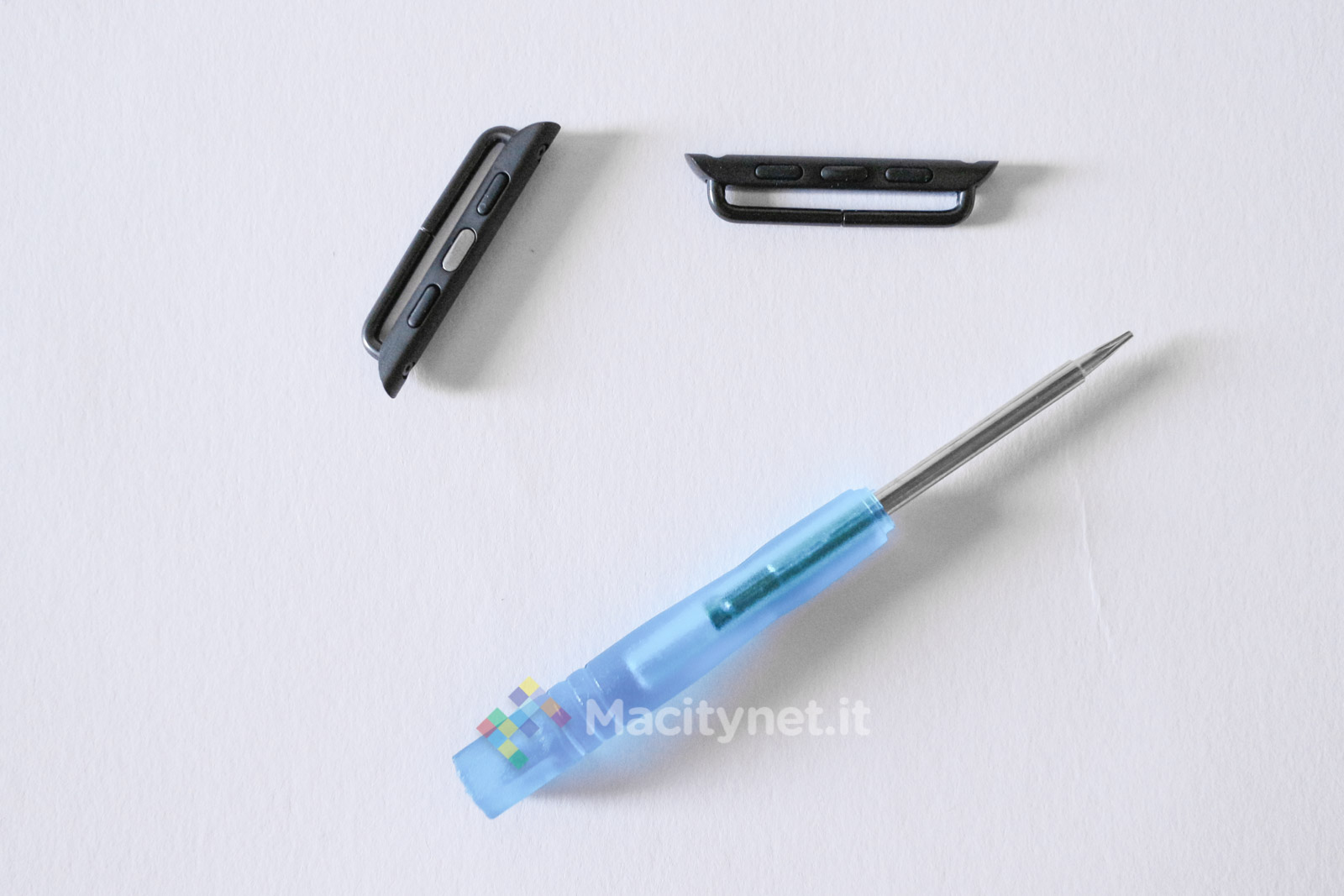 Le viti, due per ciascun adattatore, si trovano nella parte interna della fibbia, saranno quindi coperte e protette quando si agganceranno alla cassa di Apple Watch, senza così “sporcare” il design lineare dell’orologio. E’ sufficiente allentarle con il cacciavite incluso nella confezione per poter separare i due componenti tubolari che dovranno essere infilati nel classico foro del cinturino, che negli orologi tradizionali è occupato da una sottile asta a molla.