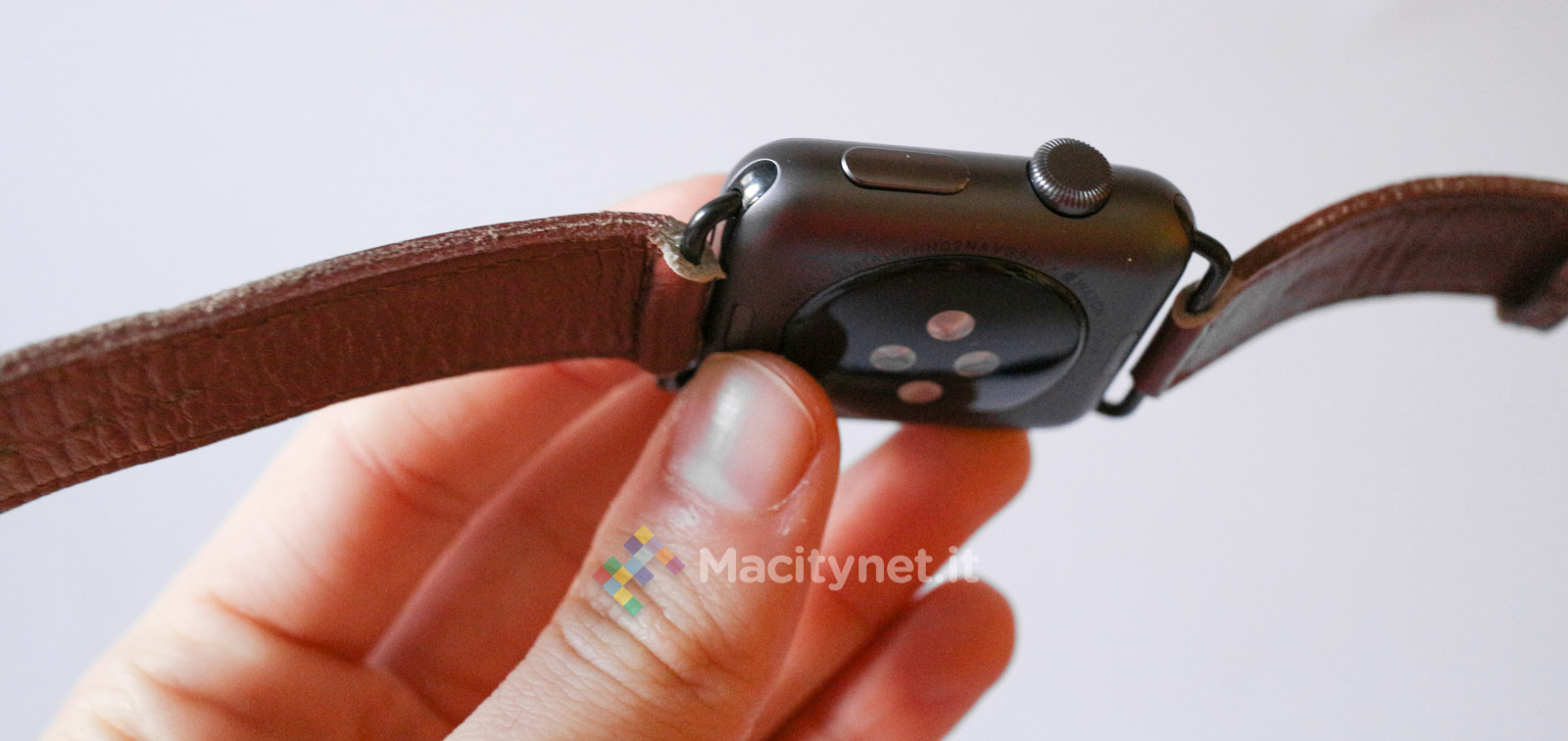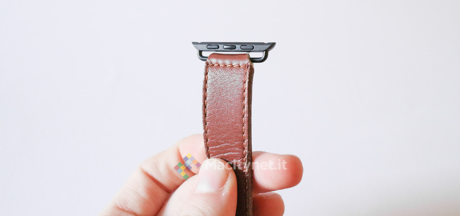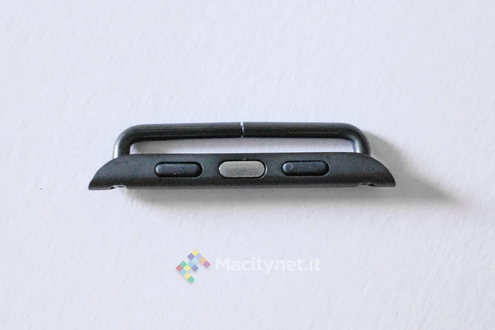 Ambo i lati di ciascuna fibbia troviamo due gommini, gli stessi che incorporano anche i cinturini originali Apple e che evitano di graffiare la cassa con il continuo aggancio-sgancio dei bracciali. Al centro c’è lo stesso meccanismo pin-and-tuck ideato da Apple che collabora proprio con il pulsante della cassa di Apple Watch per la rimozione ed il bloccaggio di ciascun cinturino.