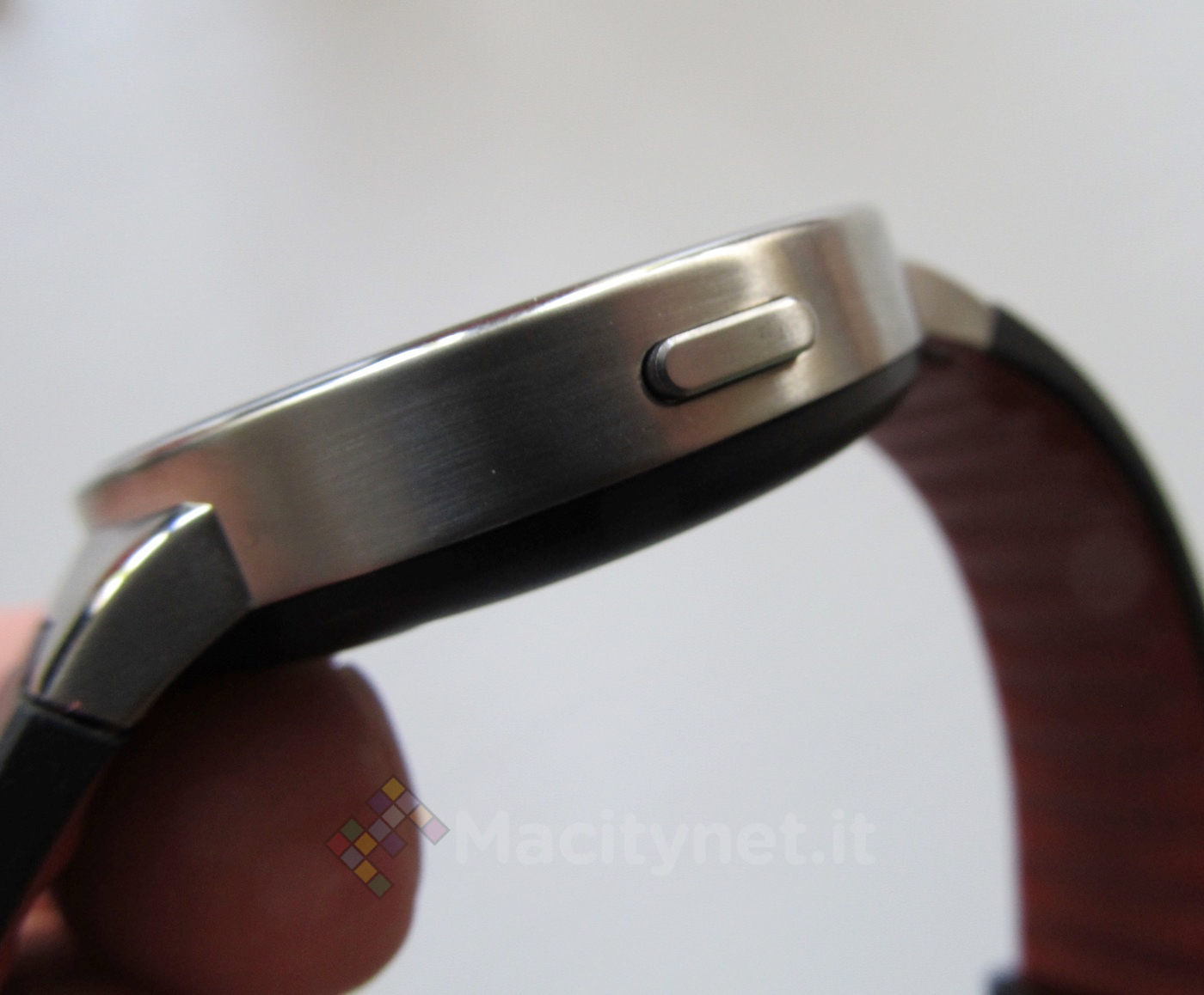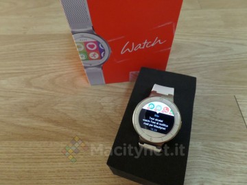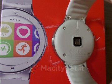 La piccola confezione di vendita di Alcatel Watch nasconde al suo interno, oltre l’orologio, manuali di istruzioni in varie lingue e una prolunga USB. Non è presente alcun cavo di ricarica, dato che il cinturino dell’orologio nasconde sapientemente un connettore USB per essere ricaricato direttamente in qualsiasi ingresso standard. L’orologio è attualmente disponibile sul mercato nelle due diverse colorazioni Bianca e Nera con cinturino sportivo, mentre in futuro dovrebbero vedere luce versioni con cinturino in metallo. Macitynet ha testato entrambe le colorazioni: entrambi gli smartwatch risultano molto eleganti e non passano inosservati al polso, ma al di là dei gusti la colorazione bianca è, probabilmente, più adatta al polso femminile. Il display è rotondo, ma come Moto 360 presenta sulla parte bassa una porzione colorata in nero, o bianco, a seconda del modello prescelto, che impedisce al display di essere completamente circolare. In realtà, su Alcatel Watch questa parte di display funge da tasto a sfioramento, che consente di tornare in dietro da qualsiasi menù. La ghiera attorno al display è fissa e presenta le classiche tacche per una facile individuazione dell’ora. E’ possibile riprodurre anche digitalmente le stesse stanghette, oppure selezionare il tema analogico senza la presenza a schermo delle linee che determinano le ore: in quest’ultimo caso si avrà un look molto più minimale, dove le lancette virtuali a schermo andranno comunque a mescolarsi con le stanghette fisiche disegnate sulla ghiera. Al di là dei due temi analogici, è possibile anche selezionare un tema con l’ora digitale. In tutto, dunque, è possibile avere tre stili di quadrante: analogico con stanghette e data, analogico solo con lancette e digitale. Per ciascuno di questi è possibile cambiare sfondo, scegliendo tra un’ampia gamma di temi predefiniti, oppure caricando una qualsiasi foto presente sul terminale.