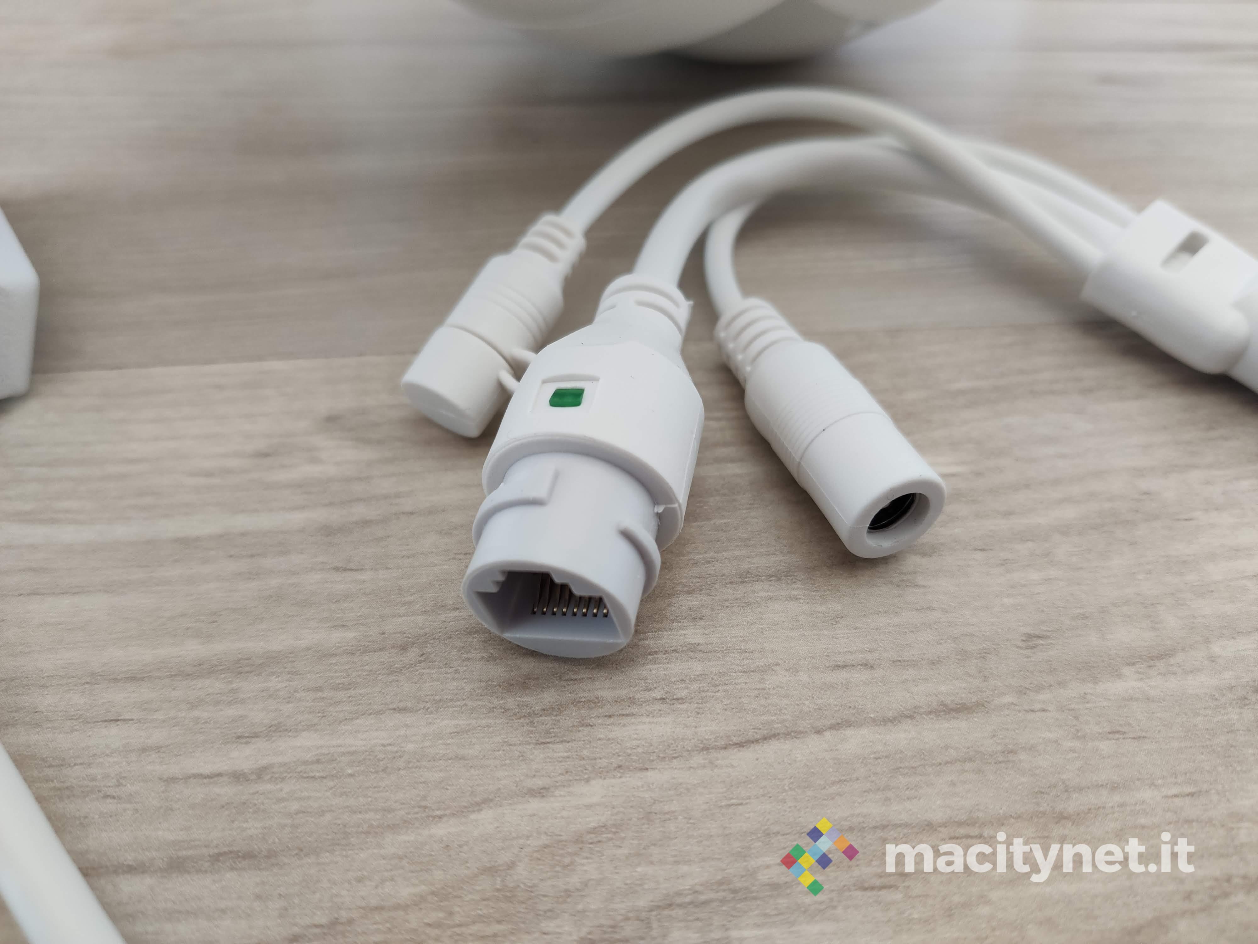 Esteticamente ha l’aspetto di una videocamera piuttosto professionale, da impiegare in locali commerciali, dietro la quale sono presenti dei cavi che servono per il collegamento ethernet, per l’alimentazione, e per il reset della videocamera stessa.