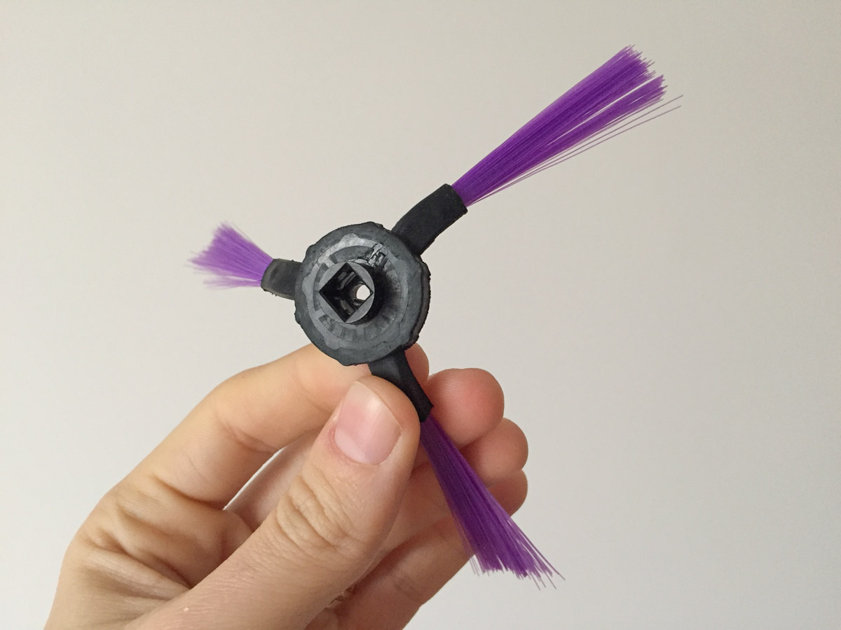 Le alette frontali sono irrobustite da uno spesso rinforzo in gomma che impedisce di graffiare i mobili con i quali potrebbe urtare durante la pulizia e sono molto morbide anche le setole delle due spazzole rotanti (viola) e del rullo centrale (giallo).