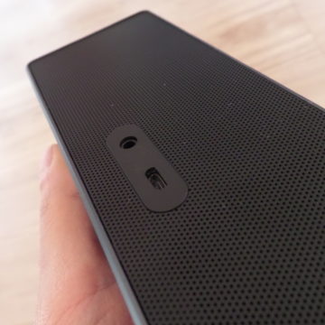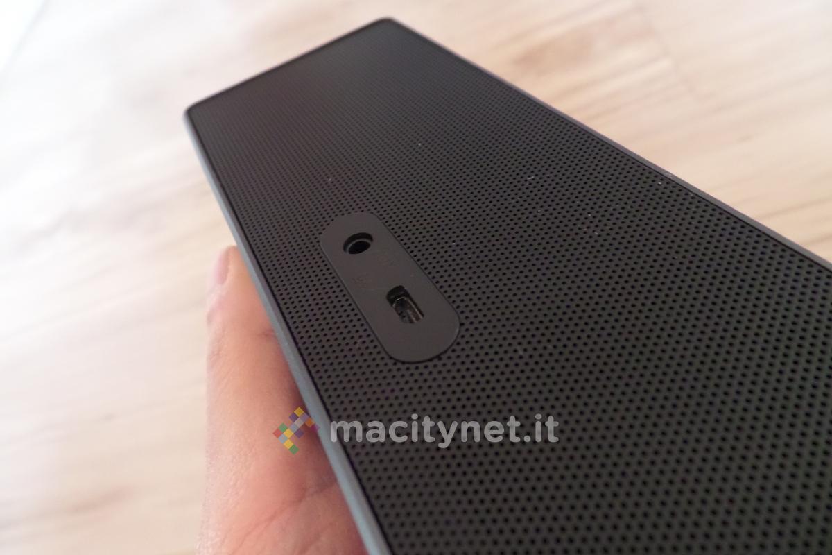 Sulla parte frontale molto bella è anche la griglia traforata, che lascia apprezzare il logo del produttore, con un stile comunque minimale e non invasivo. Sulla parte retrostante, invece, foro AUX e ingresso MicroUSB per la ricarica. Dal punto di vista estetico, teniamo a ribadirlo e uno dei migliori su questa fascia di prezzo, soprattutto per quel che concerne la costruzione, con materiali premium: è ben assemblato, solido, e non presenta alcuno scricchiolio di sorta. Inoltre, le due gomme sulla parte inferiore, permettono di “attaccare” la cassa a superfici piane, in modo quasi “appiccicoso”, senza lasciare alcun alone.