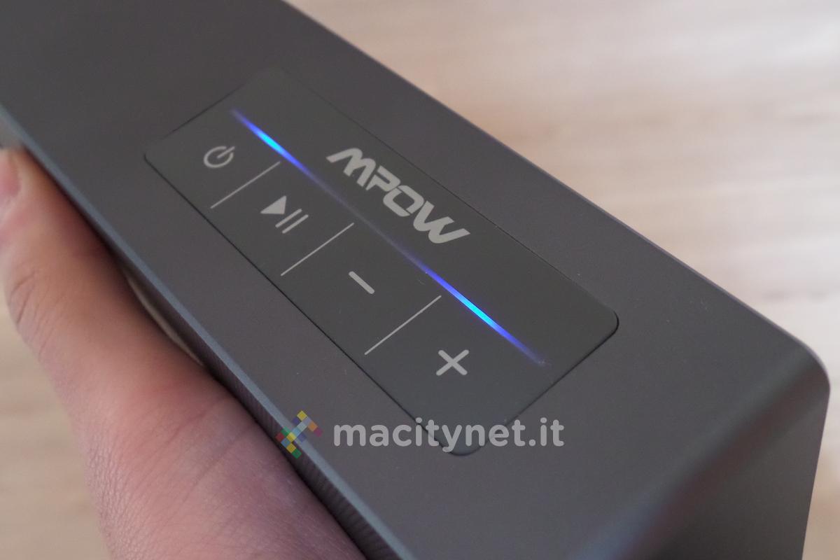 Tra i “pro”, anzitutto, l’estetica, che rappresenta certamente il primo elemento che colpisce l’utente all’apertura della confezione. Da questo punto di vista l’altoparlante MPOW in prova si difende davvero bene e per look e concezione è particolarmente vicino al noto Bose SoundLink Mini. Sarà certamente merito del metallo che lo contorna, che rende la periferica al tatto di natura premium. Sulla parte alta una raffinata pulsantiera di controllo in gomma, dove svetta il tasto di accensione/spegnimento, pausa/play, che serve anche a rispondere alle chiamate, oltre ai tasti più e meno per il controllo del volume. Su questa parte gommata insistono due LED, che si illuminano in blu e rosso per segnalare l’abbinamento, la riproduzione musicale o lo stato di carica della batteria.