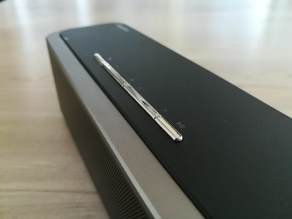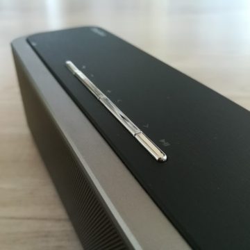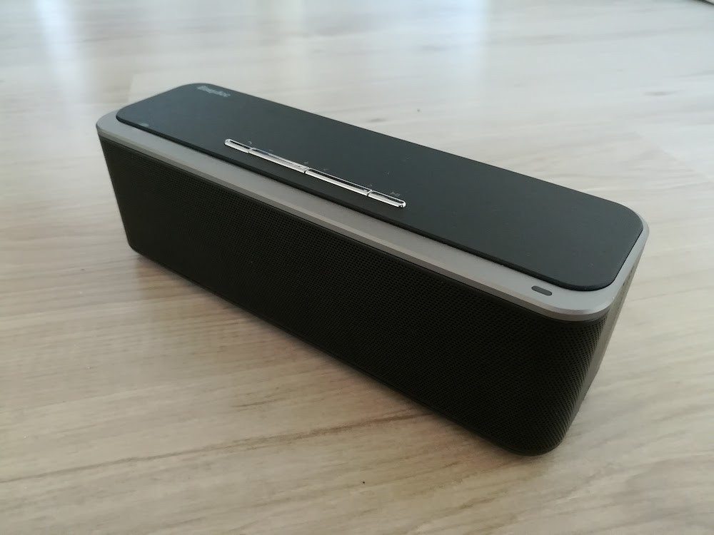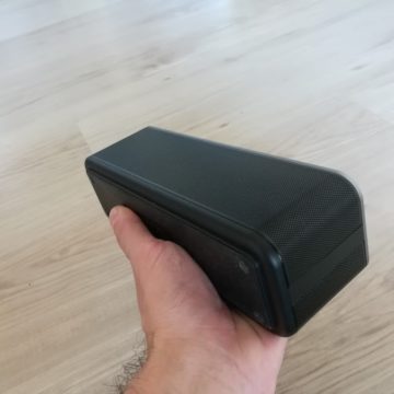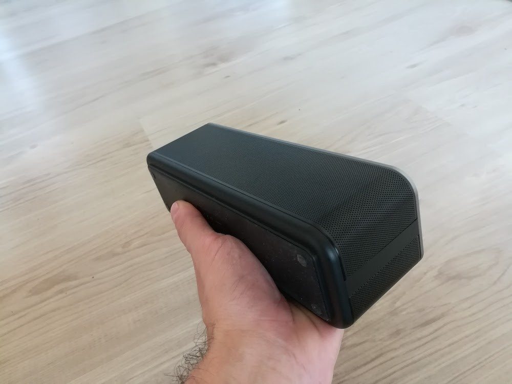 All’apertura della confezione in cartone, standard per il contenuto che presenta soltanto un cavo microUSB per la ricarica e un piccolo manuale, la cassa rende subito una sensazione di robustezza. E’ ben costruita, e pesa circa 650 grammi. Solida all’apparenza, al tatto non manifesta alcuno scricchiolio, e anche i materiali utilizzati restituiscono una piacevole sensazione quando la si prende in mano. La parte superiore è realizzata in plastica satinata, che restituisce quasi l’effetto di un finto legno. E’ proprio in questa parte che è incastonata la pulsantiera di controllo, per mettere in pausa/riproduzione la musica, aumentare/abbassare il volume, passare alla traccia successiva/precedente e rispondere alle chiamate in entrata su smartphone.