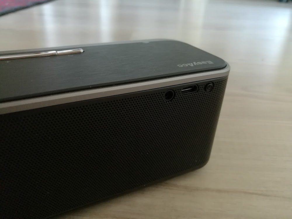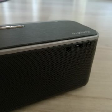 Sui quattro lati, invece, è presente la ghiera, che in prima battuta farebbe pensare ad altoparlanti predisposti su tutti i lati. Non è così, dato che il suono fuoriesce solo, e soltanto, dalla parte frontale. Ad ogni modo, il design di questo altoparlante EasyAcc è davvero ricercato, quasi non ce lo si aspetterebbe da un periferica low cost, di questa fascia di prezzo. Posizionato in qualsiasi angolo della casa, su di una scrivania, non sfigura e si fa notare. Un po’ scomodo da raggiungere, probabilmente per la minuscola dimensione, il pulsantino di accensione, posizionato sulla parte posteriore, accanto alla presa per la ricarica e all’ingresso AUX. Anche in questo caso, però, le dimensioni ridotte dei pulsanti, contribuiscono al design dell’altoparlante, davvero impeccabile.