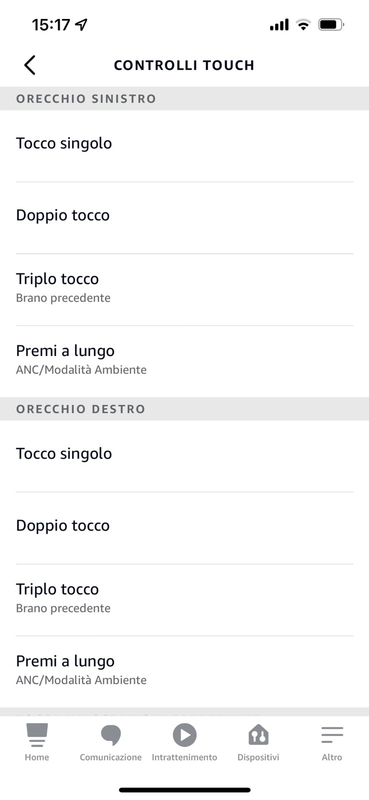 Fatte queste operazioni è possibile ricorrere ai tasti capacitivi per le funzioni più comuni. Abbiamo tre “gesture”, tocco singolo, tocco doppio, tocco triplo e pressione prolungata. Quest’ultima azione permette, tra le altre cose, di richiamare un assistente virtuale diverso da Alexa (come Siri) oppure di regolare il volume anche se di base gli viene assegnato il compito di accendere o spegnere la cancellazione del rumore.