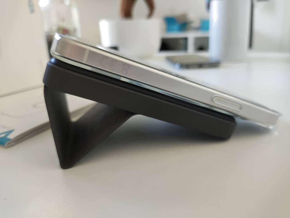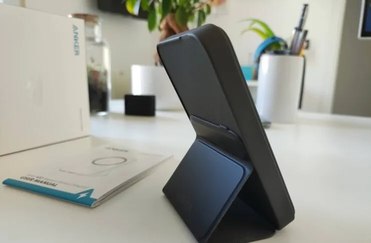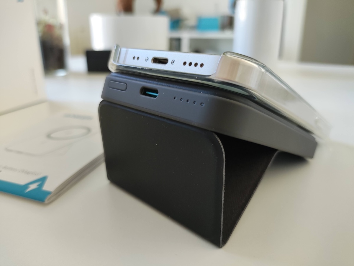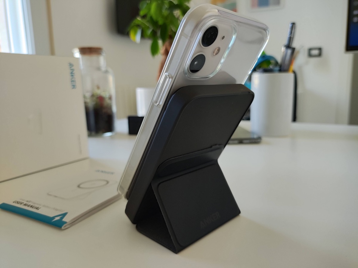 Anker 622 pesa circa 146 grammi, quindi praticamente quanto un iPhone da 6,1 pollici, che misura poco di più, 162 grammi. L’attacco magnetico presente sul retro della batteria è molto robusto, e non abbiamo registrato il minimo problema durante l’utilizzo. Se utilizzato con una cover MagSafe, o anche senza, non vi è possibilità che l’iPhone cada accidentalmente, né quando lo si regge in mano mentre si ricarica, né quando è adagiato sulla scrivania, con la linguetta ripiegata a mo di dock.