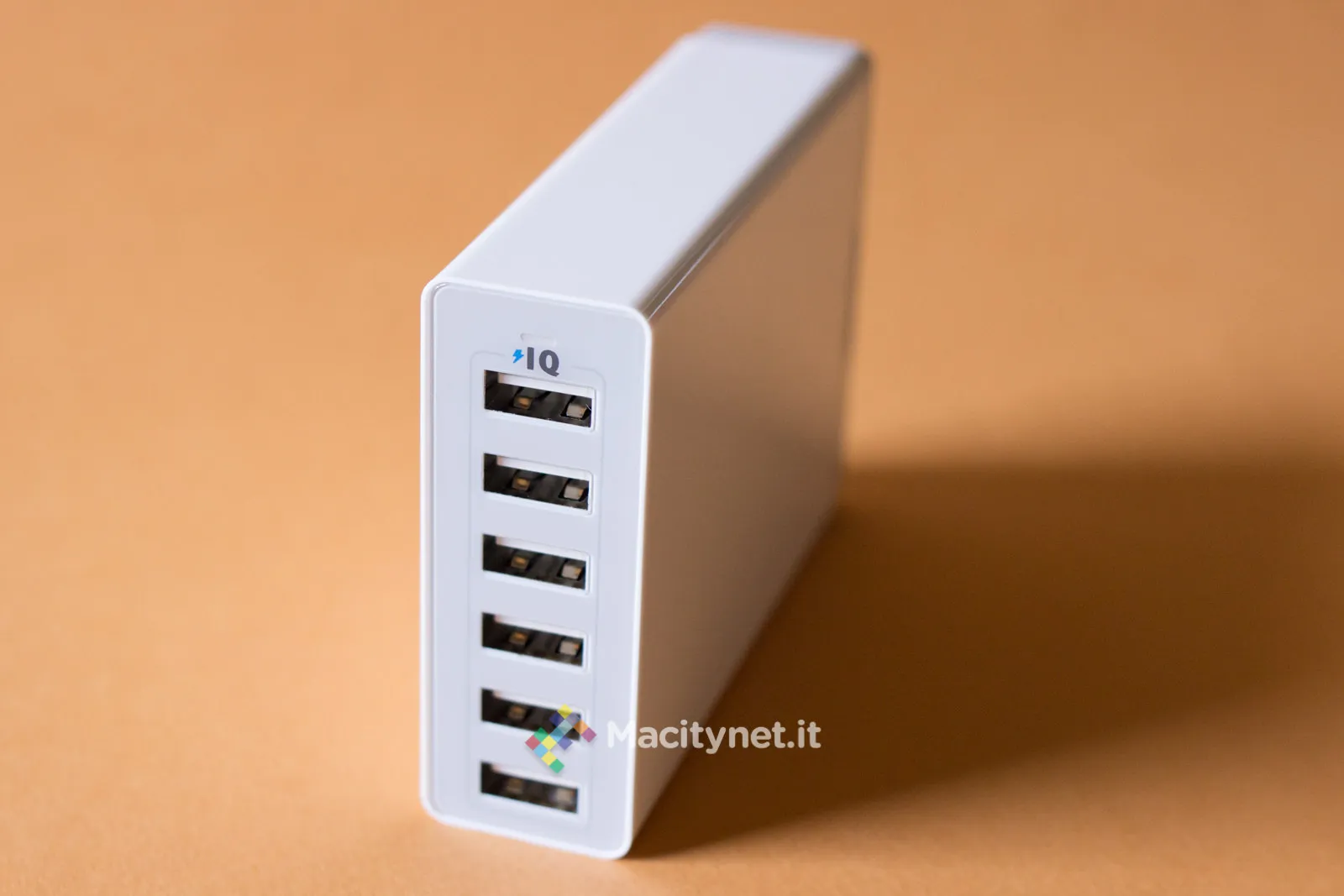 Come accennato, nella tradizione Anker, l’accessorio è in plastica di buona qualità di colore bianco e grigio, una tonalità che si abbina perfettamente sulla scrivania con periferiche come mouse Apple e l’alluminio delle macchine di Cupertino. Sul lato dove andremo a collegare i vari cavi di ricarica degli accessori troviamo solo il simbolo IQ che ci ricorda la presenza dell’omonima tecnologia, un sistema, lo ricordiamo, che è in grado di analizzare il dispositivo connesso e di fornire ad esso sempre la giusta intensità di corrente.
