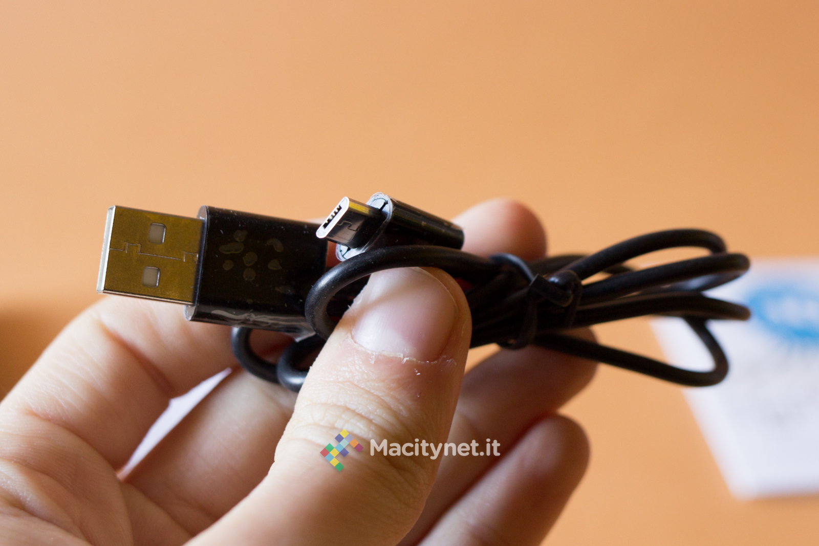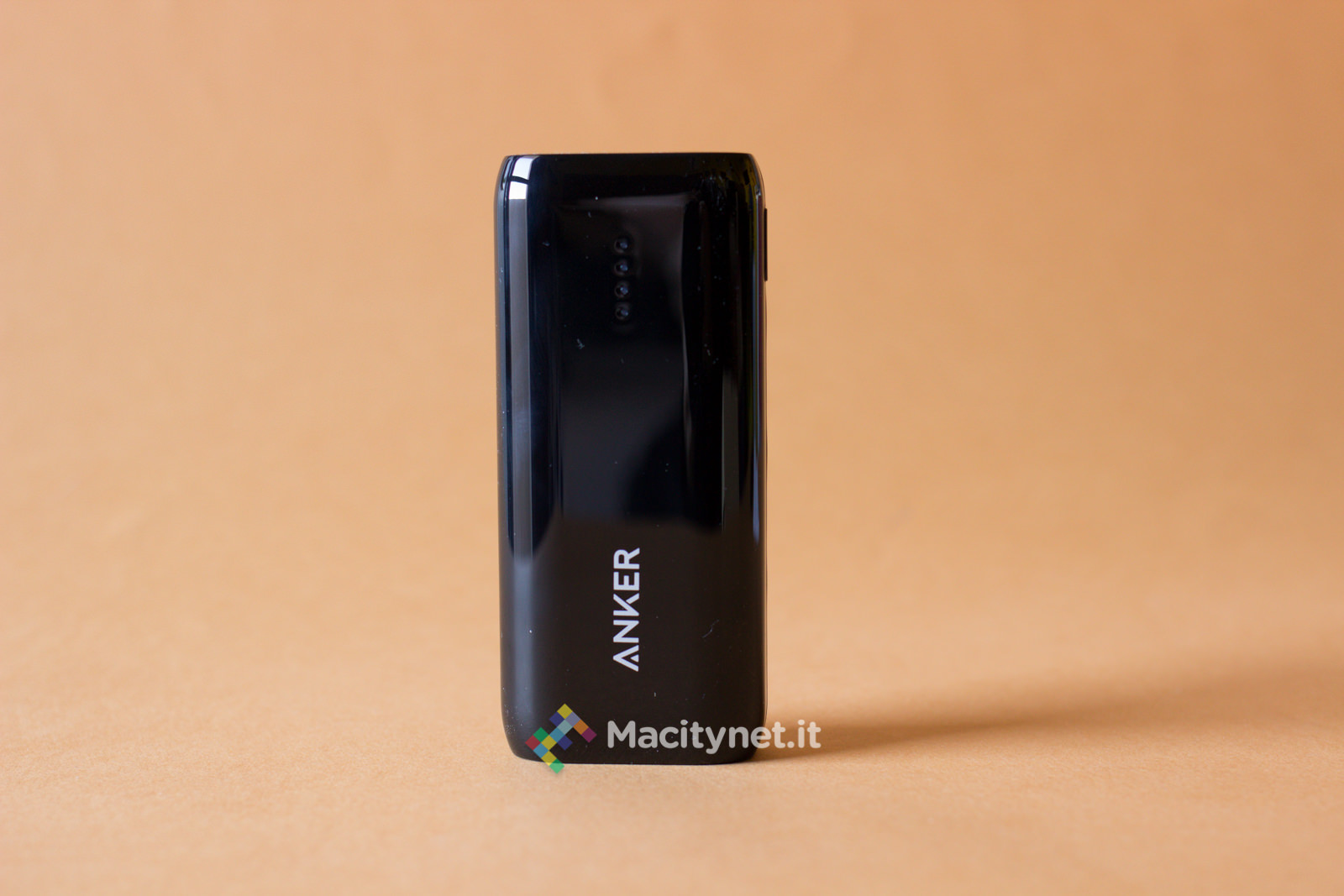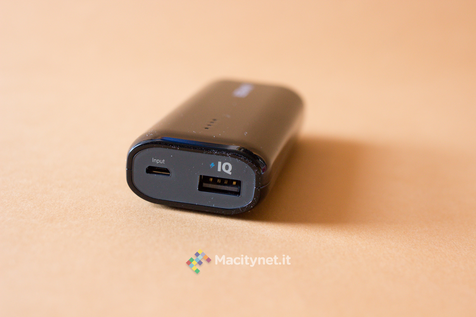 Misura 9,7 x 2 x 4 centimetri e pesa appena 120 grammi, ben distribuiti per tutto il dispositivo conferendogli una sensazione di robustezza generale data anche dalla durezza della plastica, che non si deforma neanche provando a stringerla con forza al centro, punto dove solitamente prodotti del genere mostrano maggiore flessibilità. Su uno dei due lati corti troviamo l’ingresso microUSB per la ricarica della batteria e l’uscita USB per la ricarica di smartphone e tablet, su un lato lungo invece un pulsante permette di conoscere lo stato di energia residua attivando i LED, di colore blu, posti frontalmente (ognuno rappresenta il 25% di energia).
