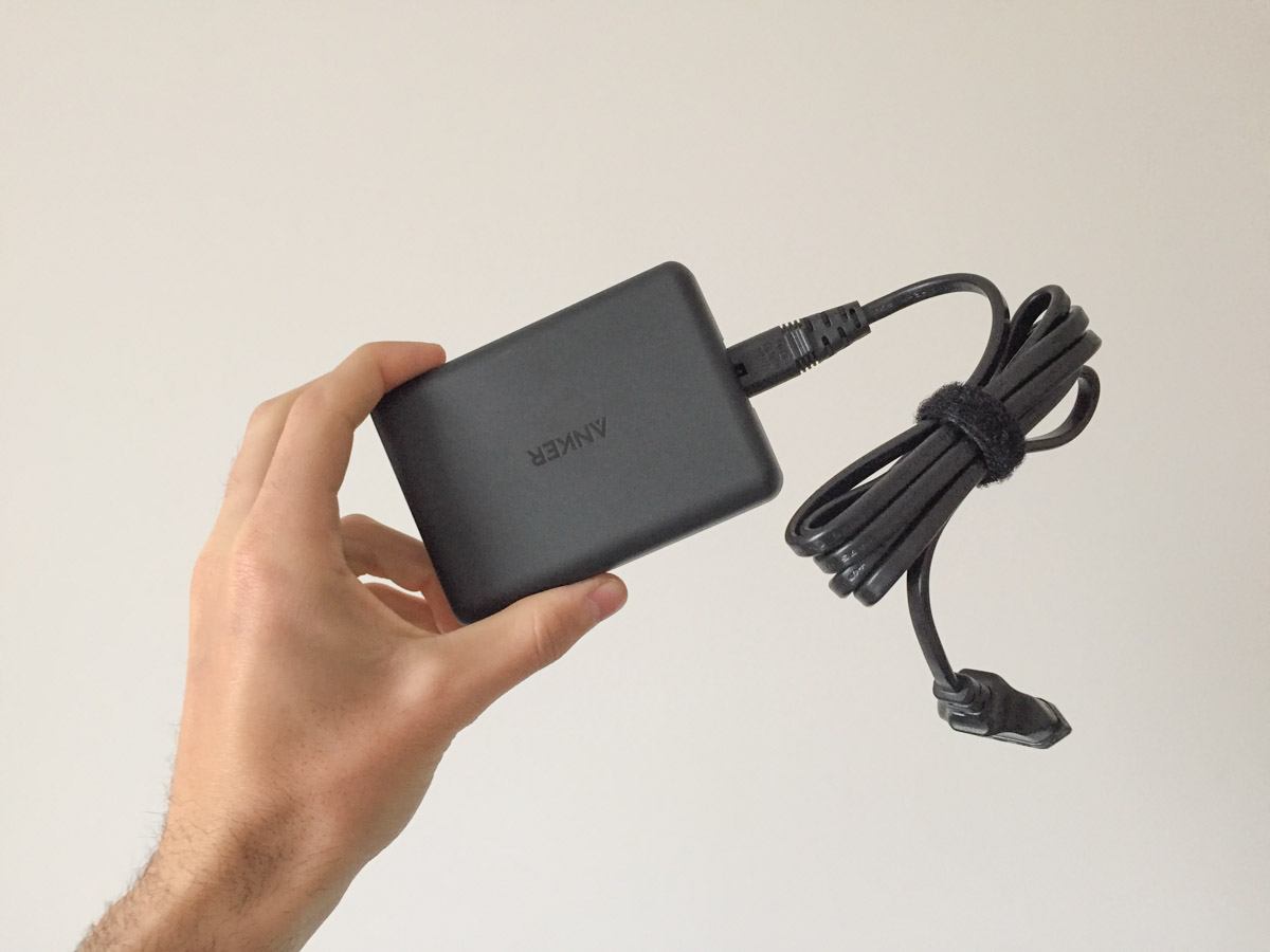 Il cavo di alimentazione è removibile ed è lungo all’incirca un metro, consentendo così di collegarlo alla presa elettrica e posizionarlo agevolmente sul tavolo o sul piano di una scrivania. Presenta cinque prese USB-A di cui due con supporto alla tecnologia QC 3.0 e riconoscibili a colpo d’occhio grazie alla colorazione azzurra della cavità interna di ciascuna porta. Le restanti tre supportano la tecnologia IQ di Anker e perciò come le precedenti sono in grado di riconoscere il dispositivo collegato e lo ricaricano alla massima velocità possibile.