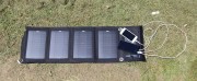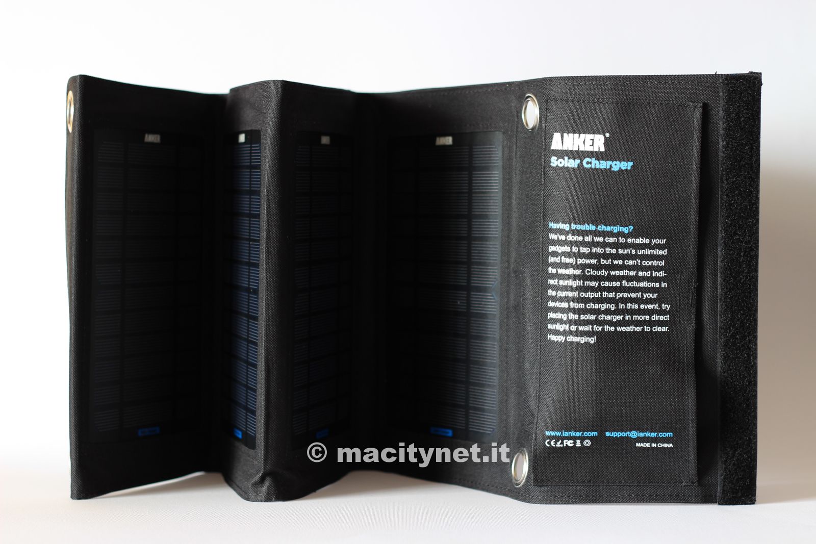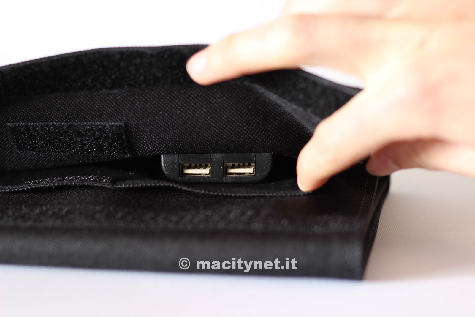 Una chiusura a strappo lo tiene ben chiuso quando non utilizzato, aprendolo la lunghezza si quintuplicherà (27,5 x 89 x 2 centimetri) in quanto avremo quattro “pagine” che accolgono i quattro pannelli solari ed una con ulteriore chiusura a strappo che accoglie le due porte USB e permette, all’occorrenza, di infilarci dentro i cavi dei dispositivi per facilitarne il trasporto.