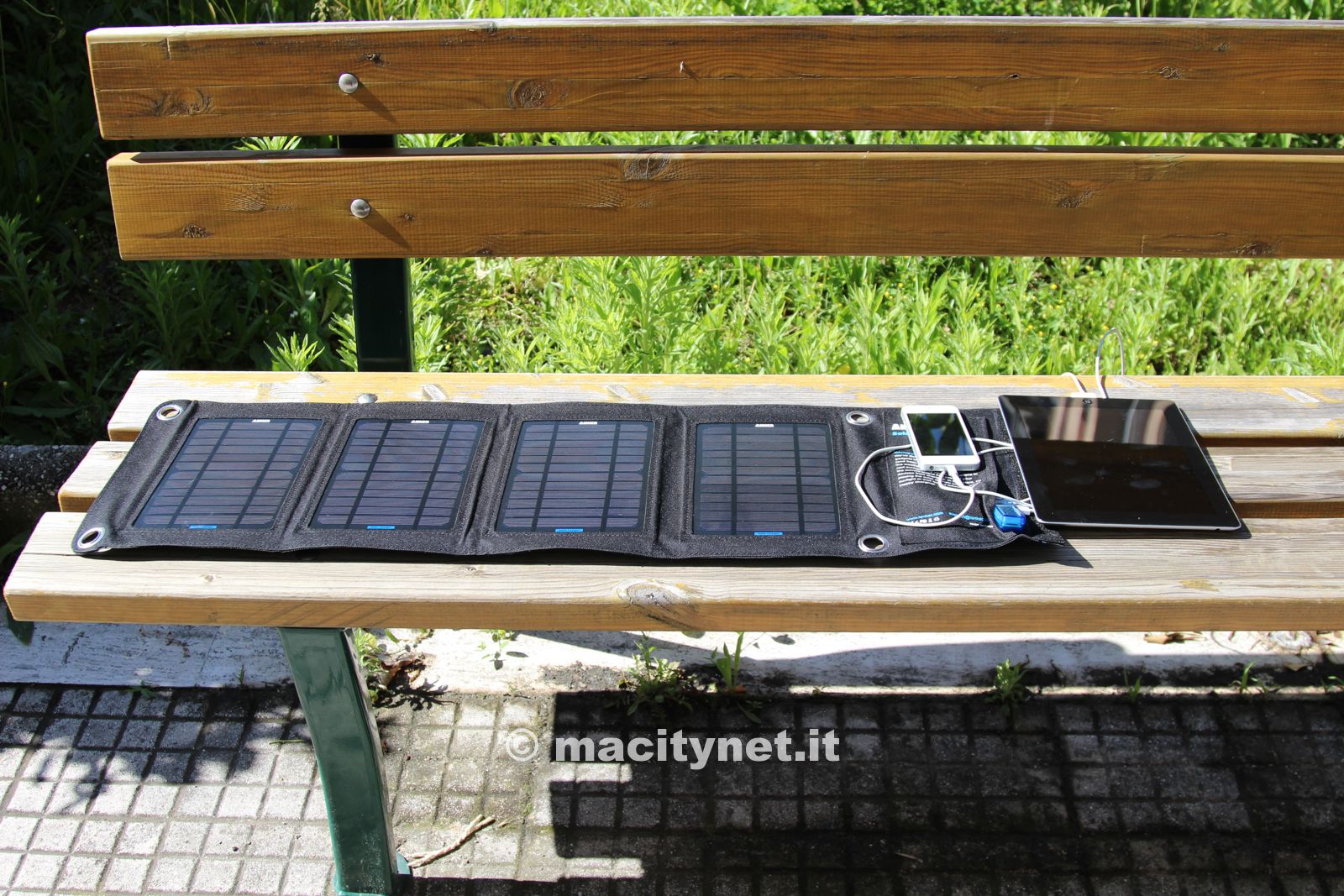 Il funzionamento, come si può ben immaginare, è davvero semplice: basta aprire completamente tutto l’accessorio, stenderlo in modo tale che i raggi del Sole possano arrivare ai pannelli solari e collegare i dispositivi da ricaricare. Potremo ricaricarne fino a due contemporaneamente, tenendo conto del fatto che complessivamente l’accessorio è capace di erogare fino ad un massimo di 2A, o almeno è questo quanto dichiara l’azienda e che in parte è stato confermato dai nostri test di cui discuteremo nella pagina seguente.