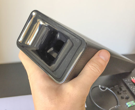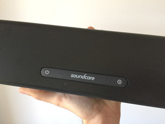 Ai lati presenta due ampie cavità che rappresentano i due subwoofer dedicati alla diffusione delle basse frequenze, mentre i pulsanti di controllo sono intelligentemente nascosti sulla striscia frontale con copertura in gomma dove è impresso il marchio Soundcore.