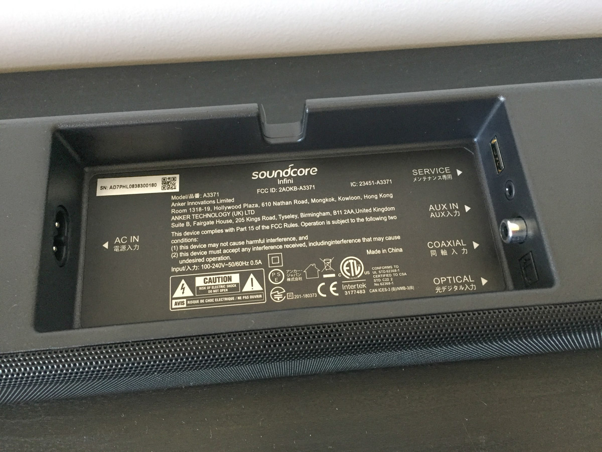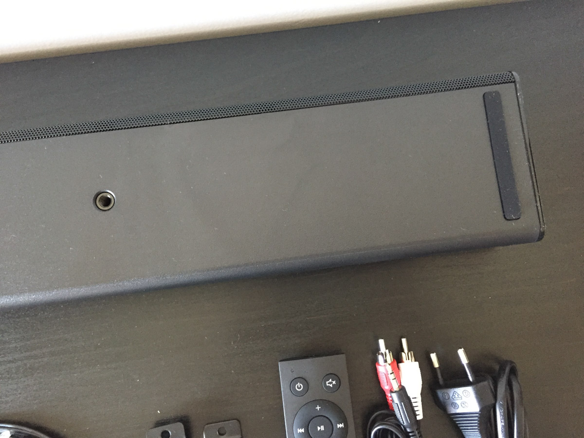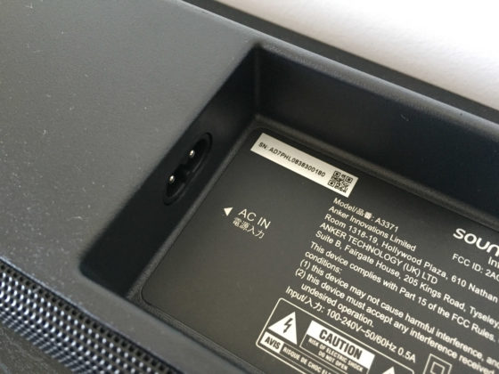 L’azienda ha perfezionato anche la sezione dedicata ai collegamenti: le porte USB, audio ottico, AUX e coassiale così come la presa di alimentazione sono alloggiate all’interno di un incavo e i cavi possono essere instradati attraverso una fessura che permette di poggiare la soundbar su un piano o fissata al muro (in confezione trovate piastre, viti e schema semplificato per il corretto posizionamento a parete) senza mai schiacciarli.