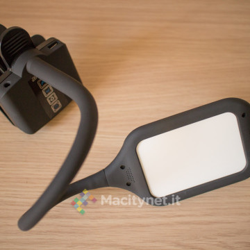 Per finire l’abbiamo spostata in salotto – ed è rimasta qui per il resto delle nostre prove – agganciandola al bordo di un mobile adiacente al divano, usandola con la temperatura colore media ad un’intensità di luce che regoliamo di volta in volta in base all’illuminazione della stanza ed al momento della giornata. E’ qui che abbiamo sfruttato maggiormente la possibilità di ricaricare contemporaneamente anche un dispositivo: di fatto abbiamo lasciato sempre agganciato un cavo Lightning al quale, occasionalmente, abbiamo collegato il nostro iPhone 6 Plus, misurando una potenza in uscita pari a 1,48 A quando si trovava al 12% di energia residua.