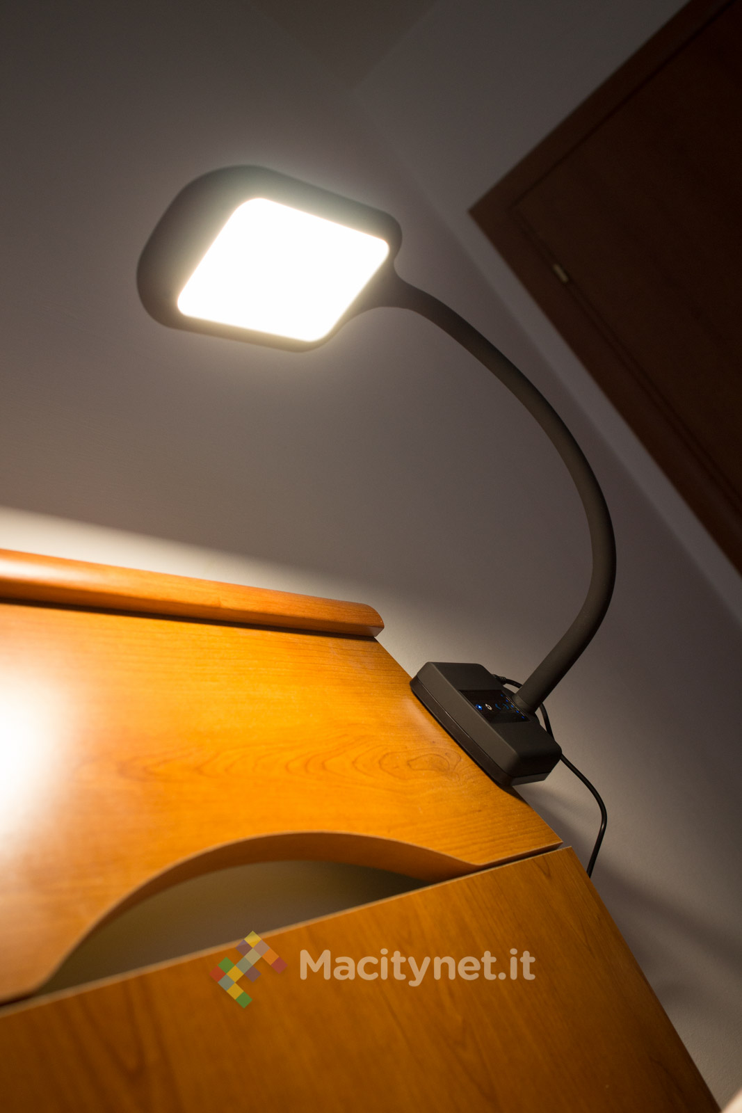 L’abbiamo poi spostata sulla scrivania, testando il massimo della potenza e con una temperatura del colore più fredda. La luce anche al massimo dell’intensità è omogenea, senza sfarfallii e può essere anche guardata direttamente senza restare abbagliati.