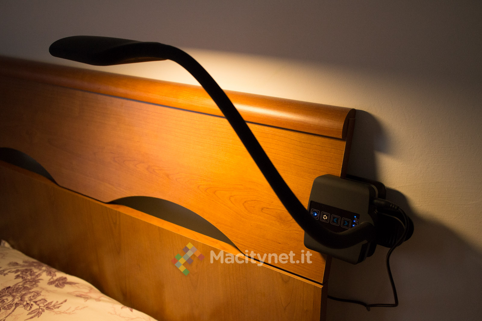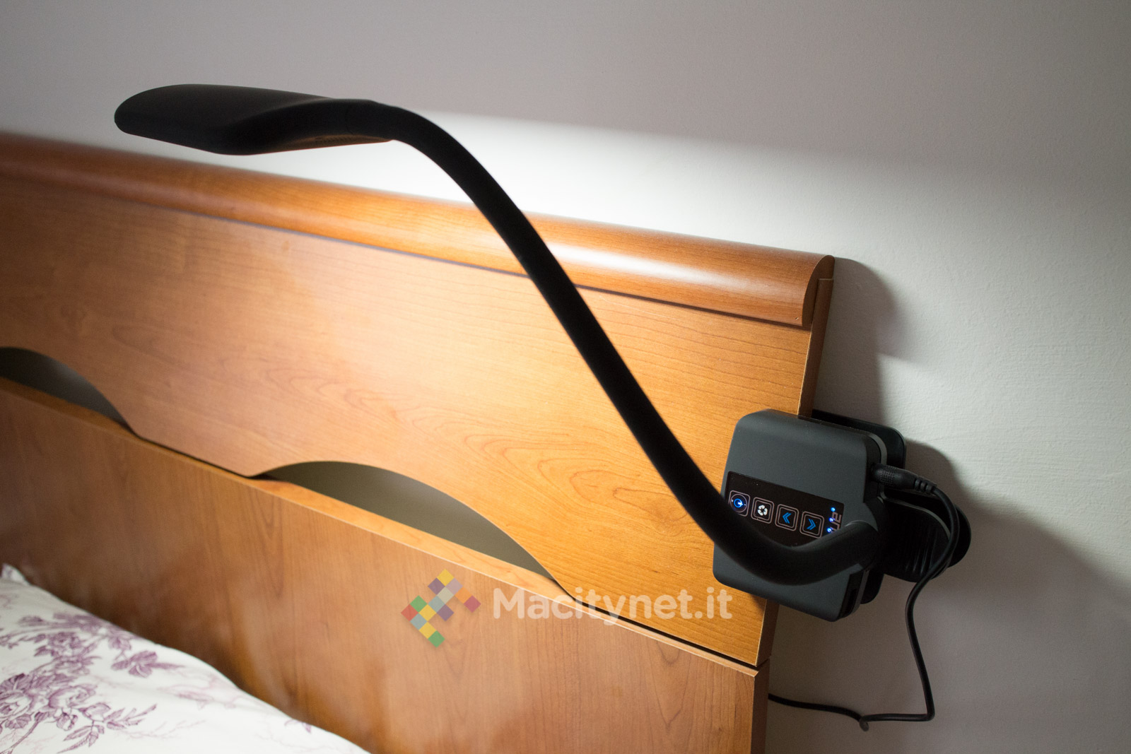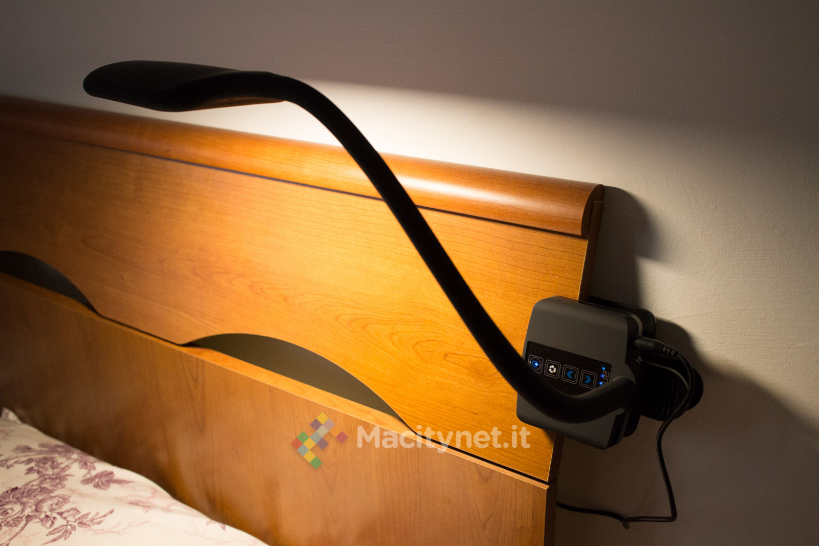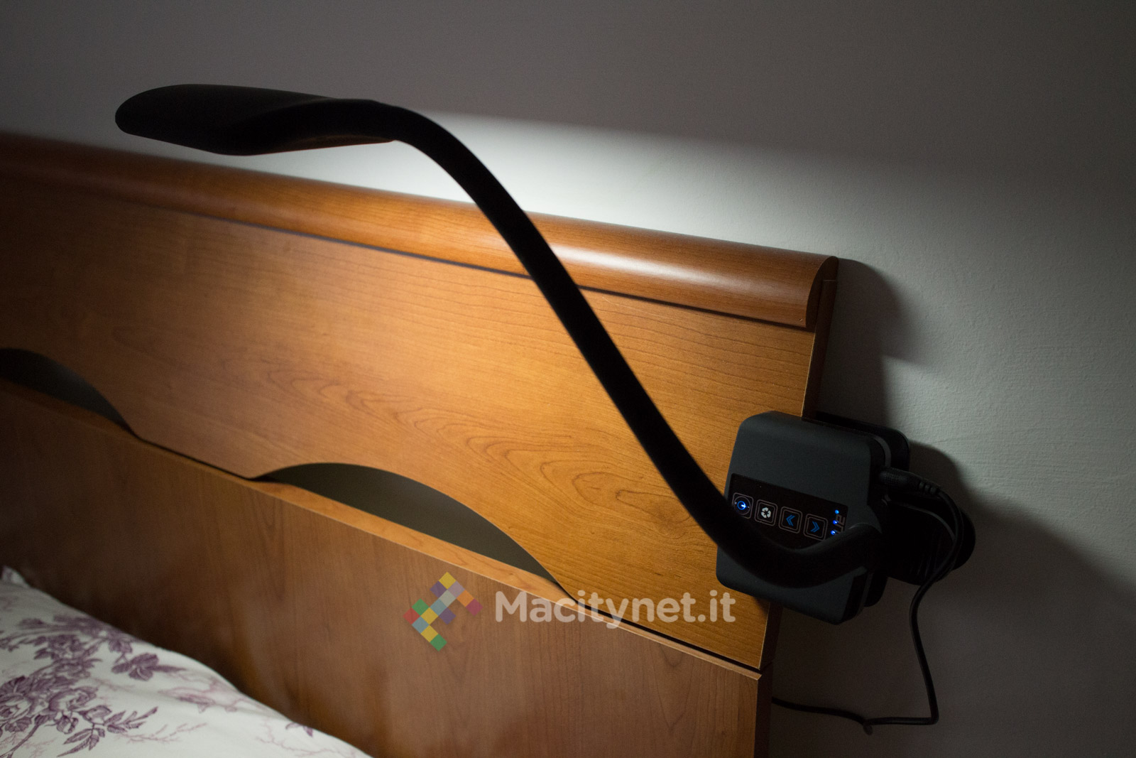 L’abbiamo inizialmente agganciata alla spalliera del letto per usarla come fonte di luce per le nostre letture a fine giornata. Grazie alla possibilità di “scaldare” la luce si riesce ad ottenere una illuminazione confortevole specialmente se l’intenzione è quella di usarla prima di andare a dormire.
