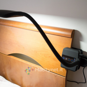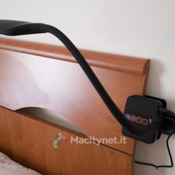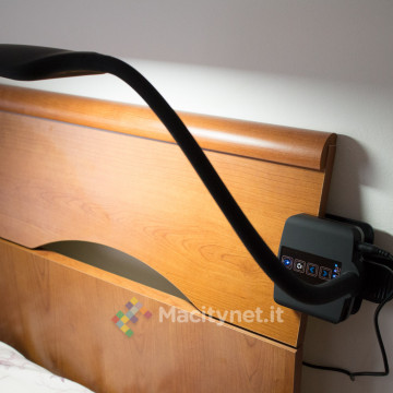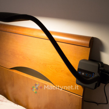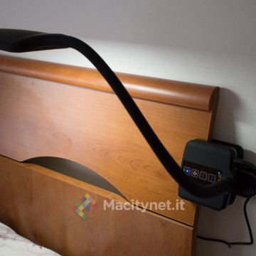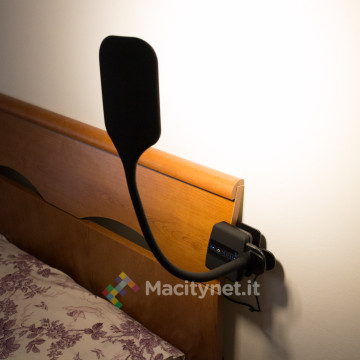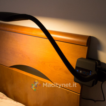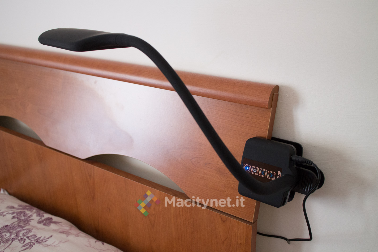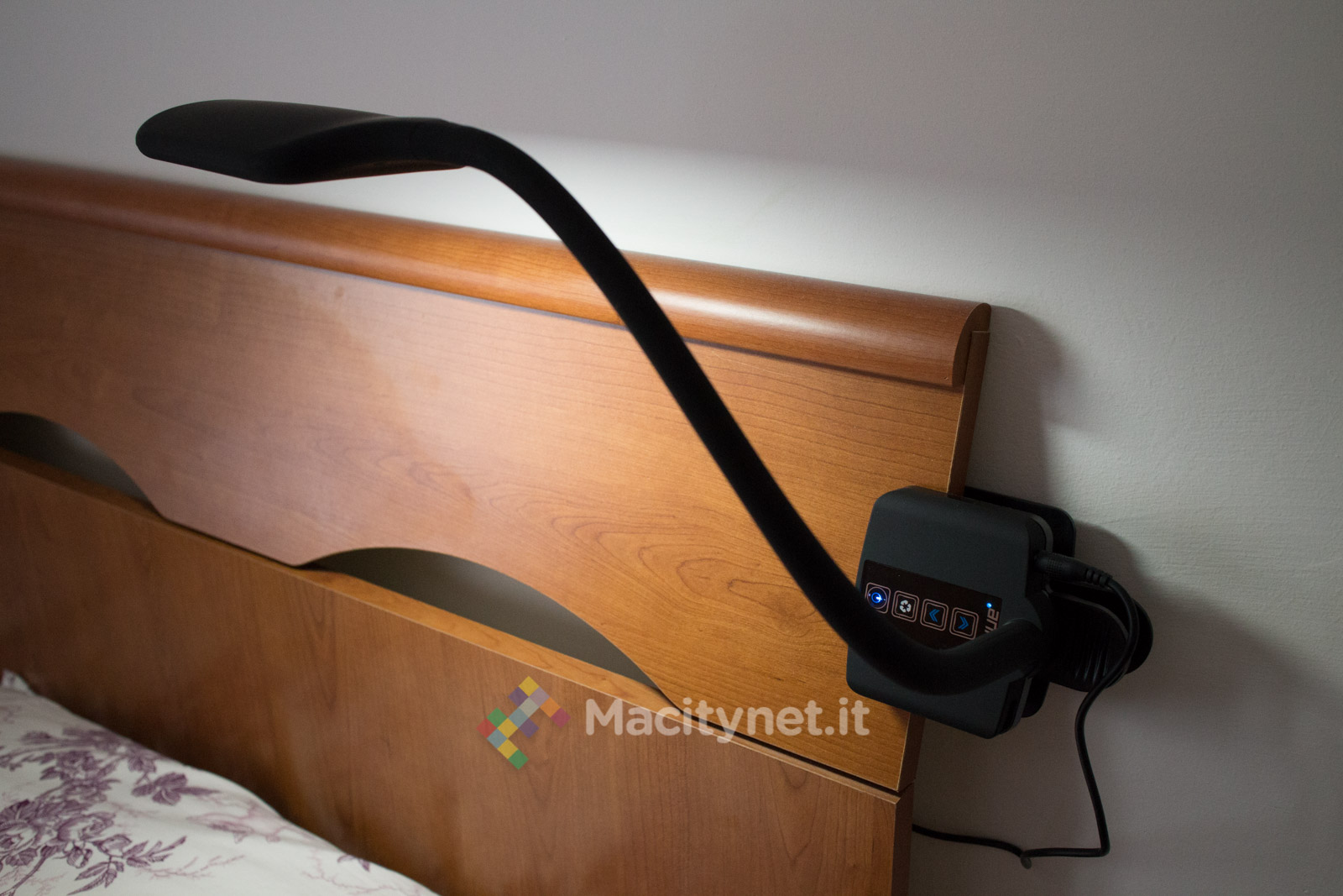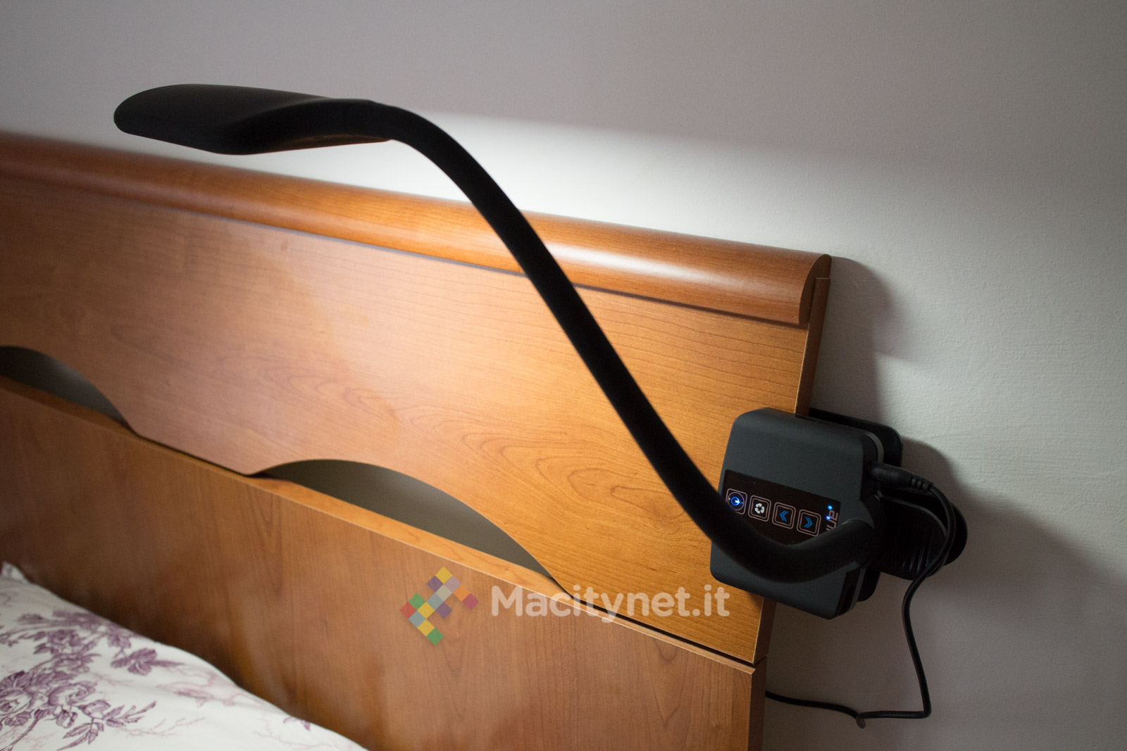 L’abbiamo inizialmente agganciata alla spalliera del letto per usarla come fonte di luce per le nostre letture a fine giornata. Grazie alla possibilità di “scaldare” la luce si riesce ad ottenere una illuminazione confortevole specialmente se l’intenzione è quella di usarla prima di andare a dormire.