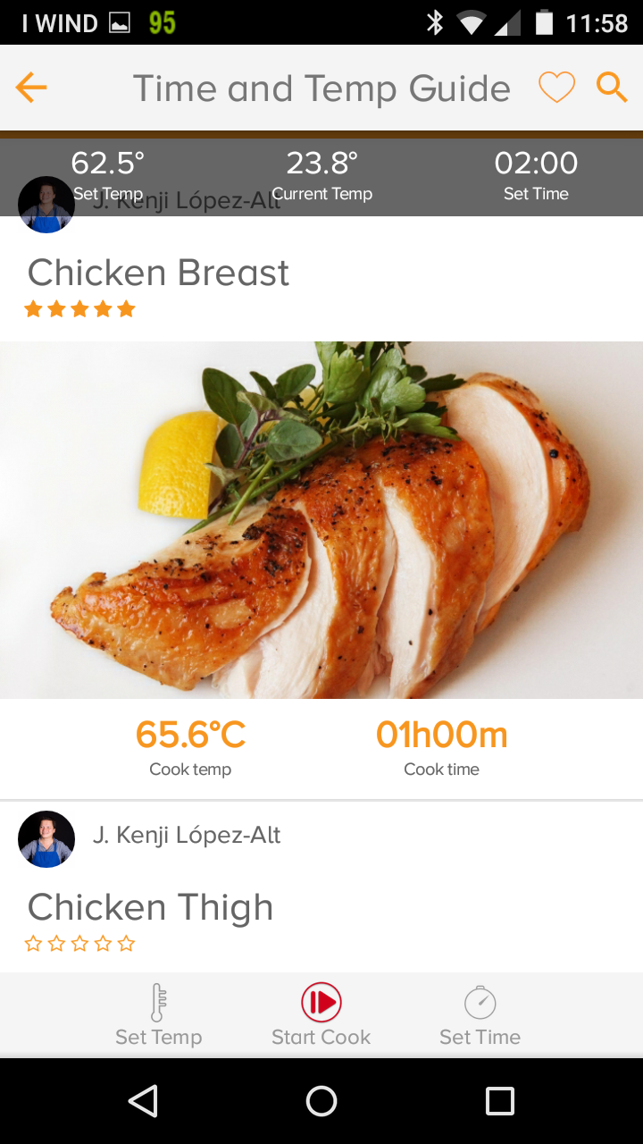 La schermata principale è divisa in tre diverse sezioni: la prima sezione – realizzata in collaborazione con Serious Eats – vi aiuterà ad impostare automaticamente temperatura e tempi di cottura in base all’alimento da voi scelto. Potrete scegliere l’alimento, il grado di cottura ed impostare anche lo spessore del taglio. Al momento mancano le verdure e il pesce, mentre sono presenti manzo, pollo, hamburger e costine.