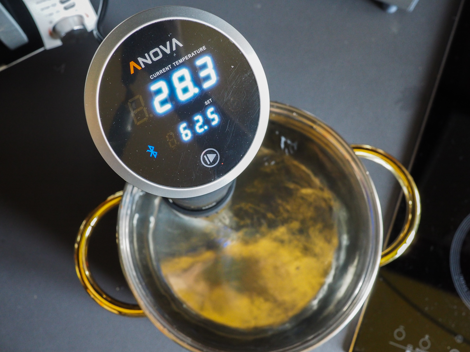 A questo punto non resta che impostare la temperatura desiderata e il tempo di cottura: l’Anova Precision Cooker inizierà a scaldare l’acqua fino al raggiungimento della temperatura richiesta, momento in cui potrete poi immergere il vostro alimento sottovuoto ed iniziare la fase di cottura. Se lo desiderate, potete pre-riscaldare l’acqua usando una fiamma alimentata a gas, riducendo così il consumo elettrico necessario all’Anova per portare a temperatura i litri di liquido da utilizzare; la maggior parte del consumo energetico avviene infatti in questa fase, mentre per il mantenimento della temperatura il costo di gestione è più ridotto.