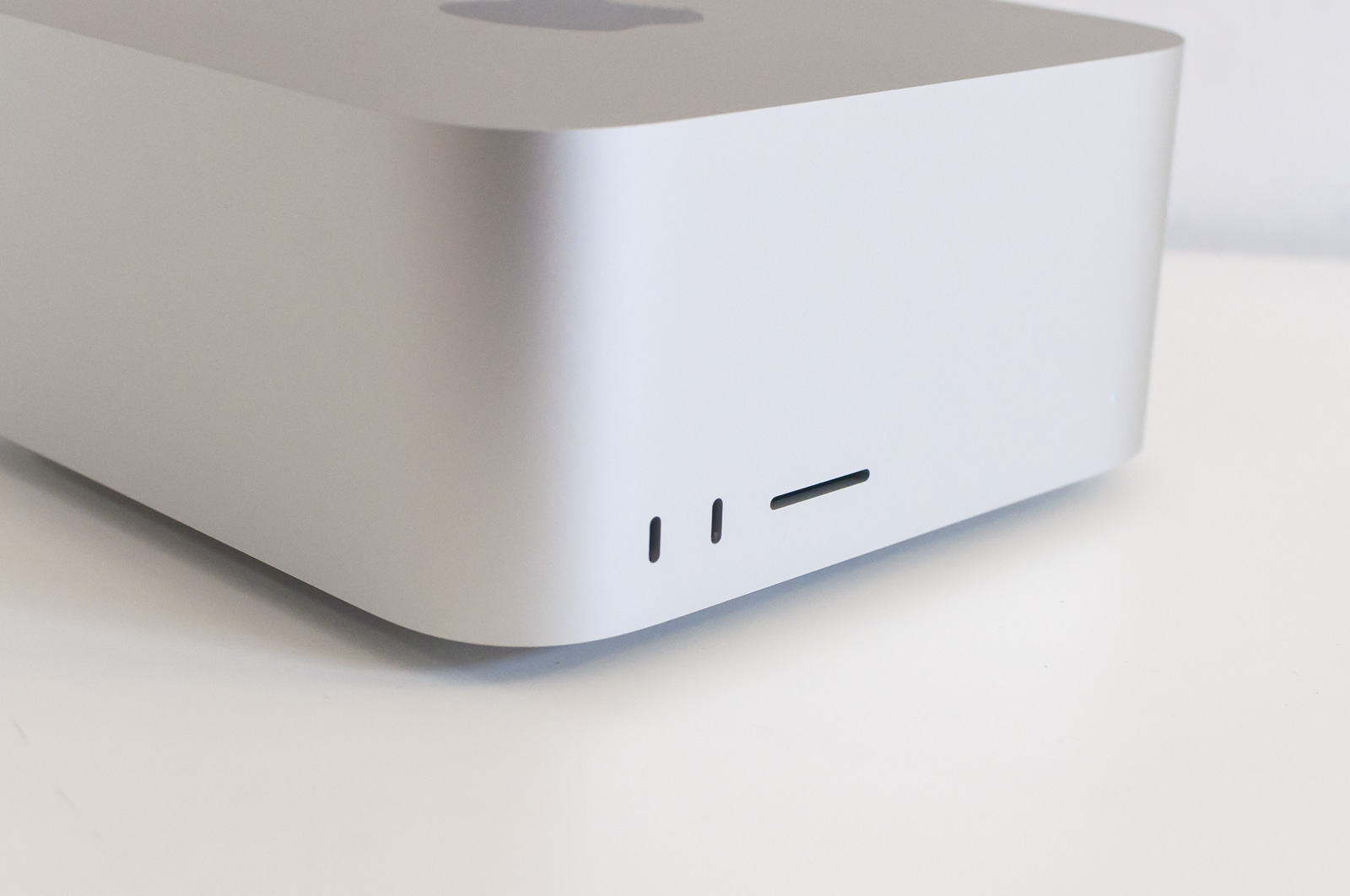 Il numero di porte è importante per un computer così piccolo e varia in base al modello selezionato: nel nostro caso si tratta di un Mac Studio con M1 Max, con frontalmente due porte USB‑C (fino a 10 Gbps, che diventano porte Thunderbolt 4 nella versione con chip M1 Ultra) e un lettore SDXC Card, oltre ad un piccolo LED di colore bianco nella parte opposta che identifica l’accensione, ma che diventa giallo in caso di problemi.