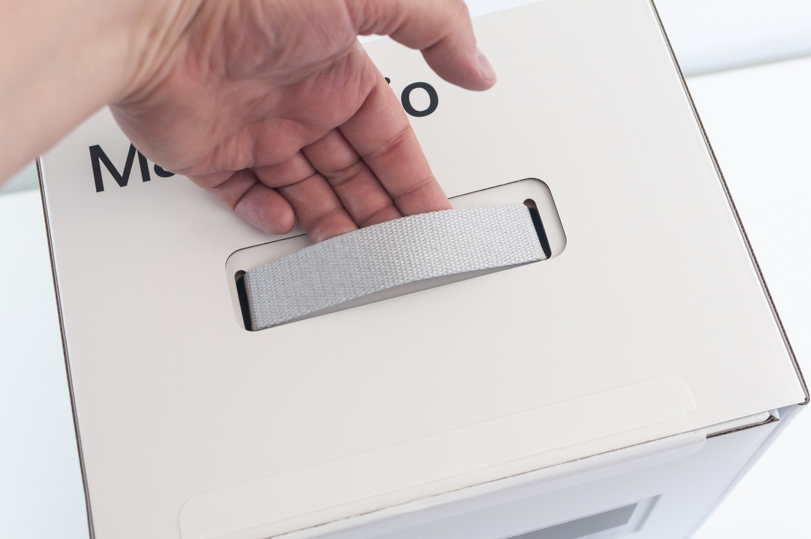La scatola infatti presenta una maniglia in tessuto molto resistente (per sorreggere i circa 3 KG della confezione nel nostro caso) che al tempo stesso è utile per il trasporto ma anche comoda per tenere la scatola chiusa (e il Mac al sicuro) nel movimento.