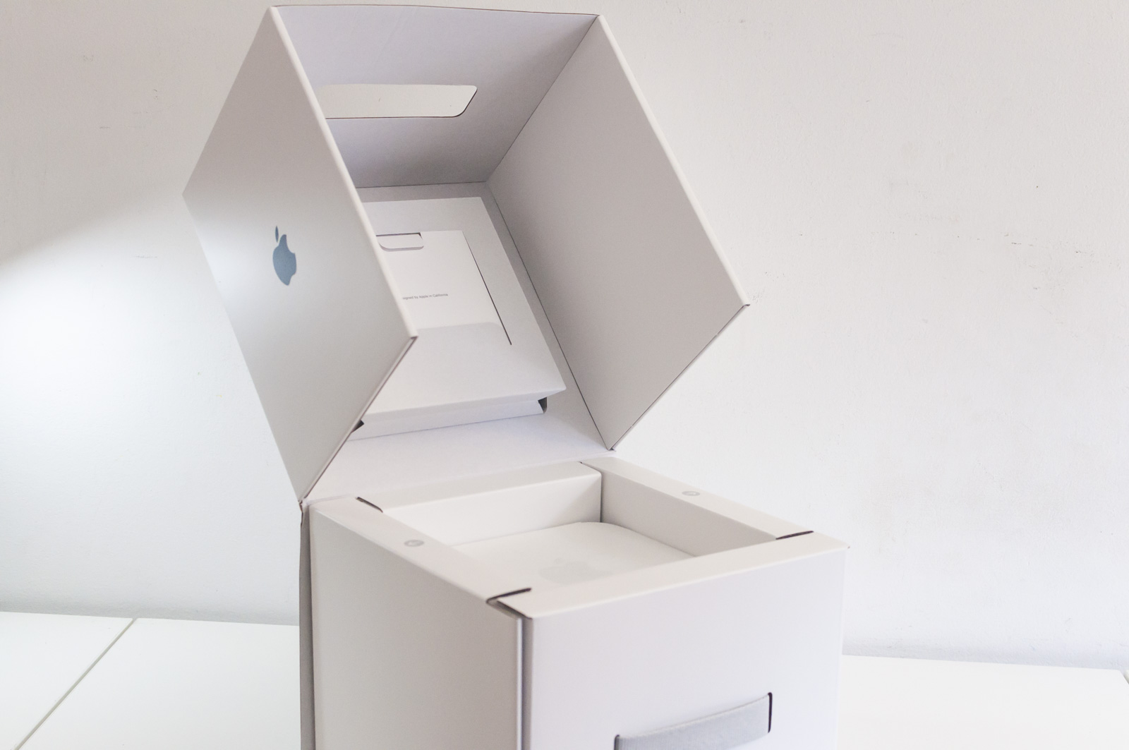 Durante l’apertura la scatola alza il coperchi e lascia intravedere la parte superiore del Mac, con la mela nera: a questo punto, dato che sarebbe difficile estrarre il parallelepipedo così finemente alloggiato nella sua culla, è possibile aprire le ali esterne e prendere quindi il Mac molto più comodamente.