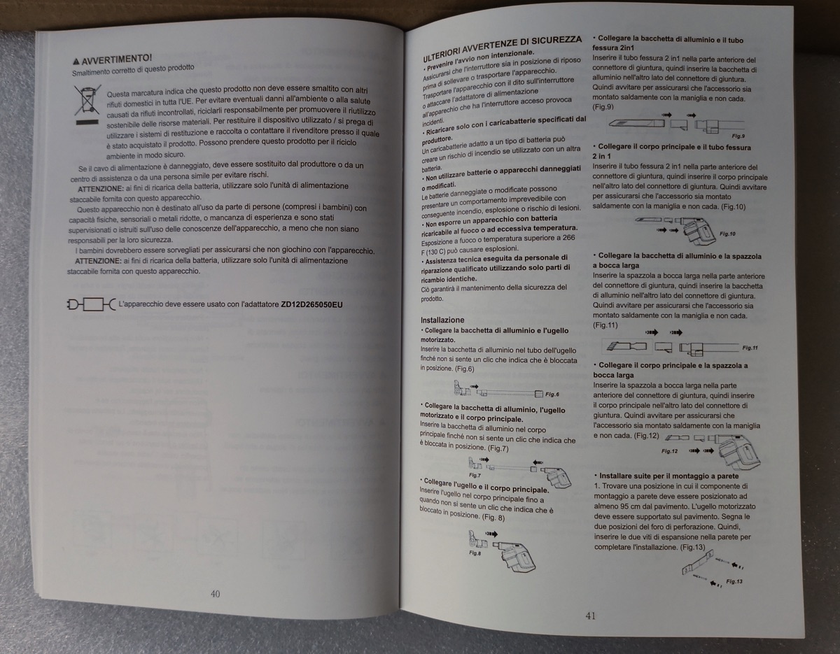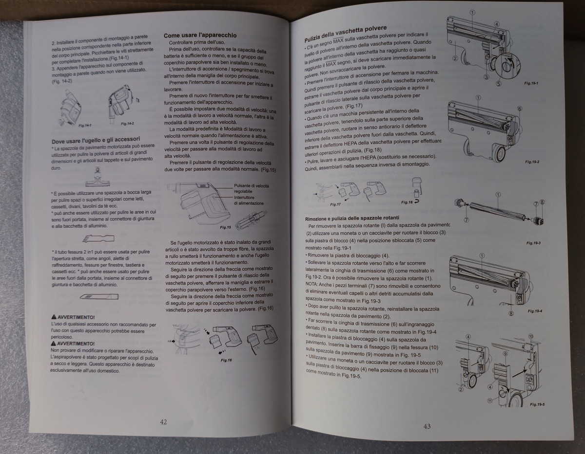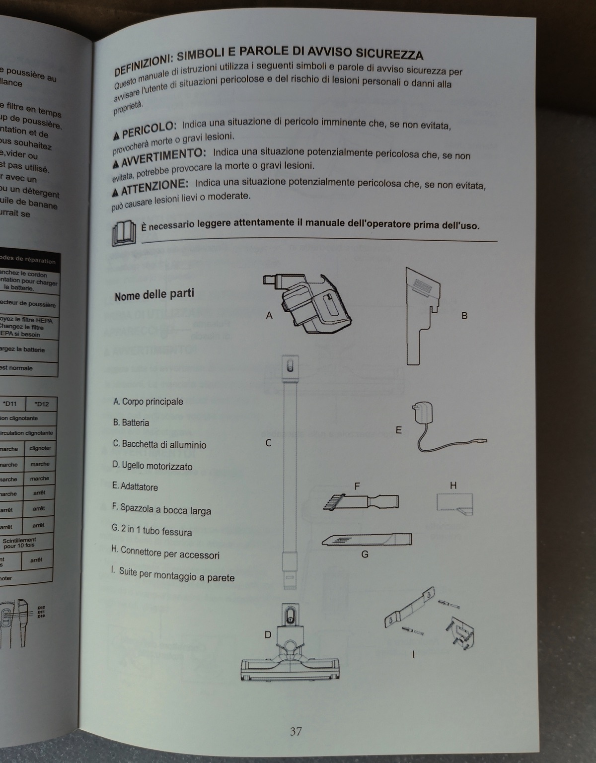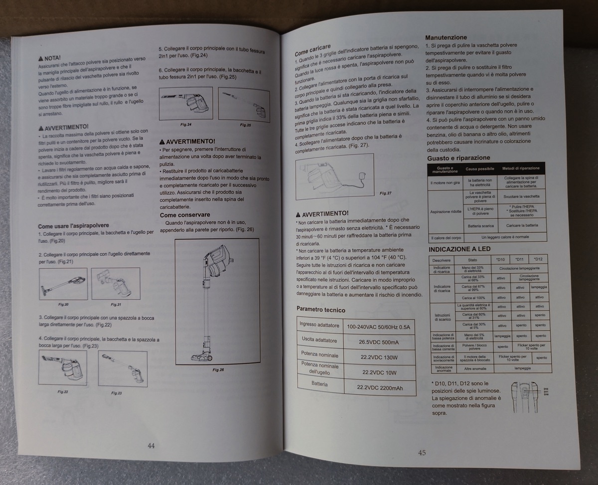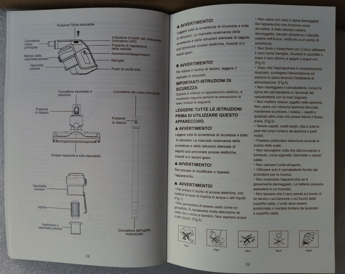 Apparecchio solido, ben costruito, facile pulire la spazzola da pavimenti, batteria removibile, potenza di aspirazione buona, buona durata alla massima potenza, attacchi dei componenti molto solidi. Facilità di accesso al serbatoio e filtro HEPA con ricambio. Manuale in italiano.