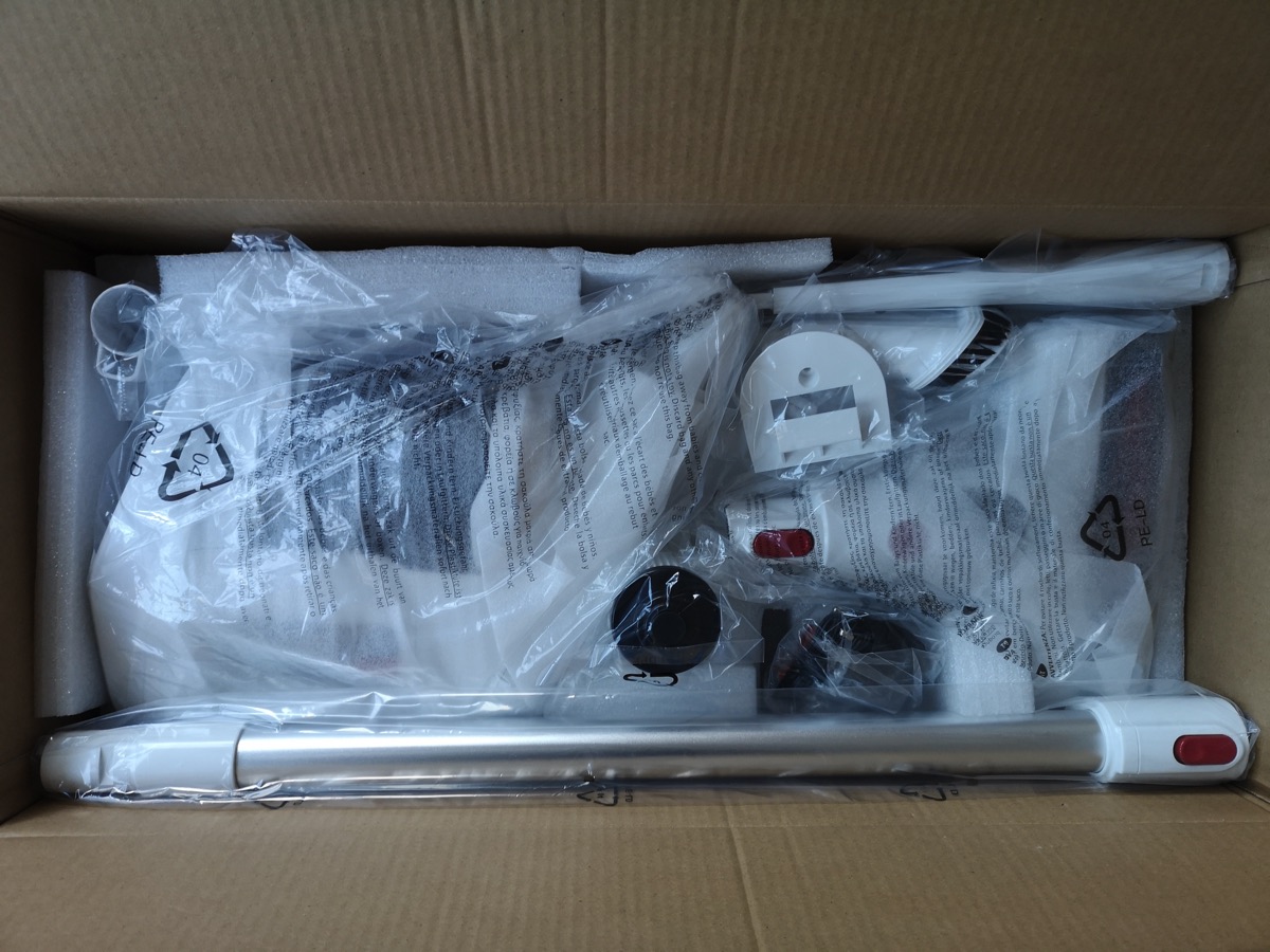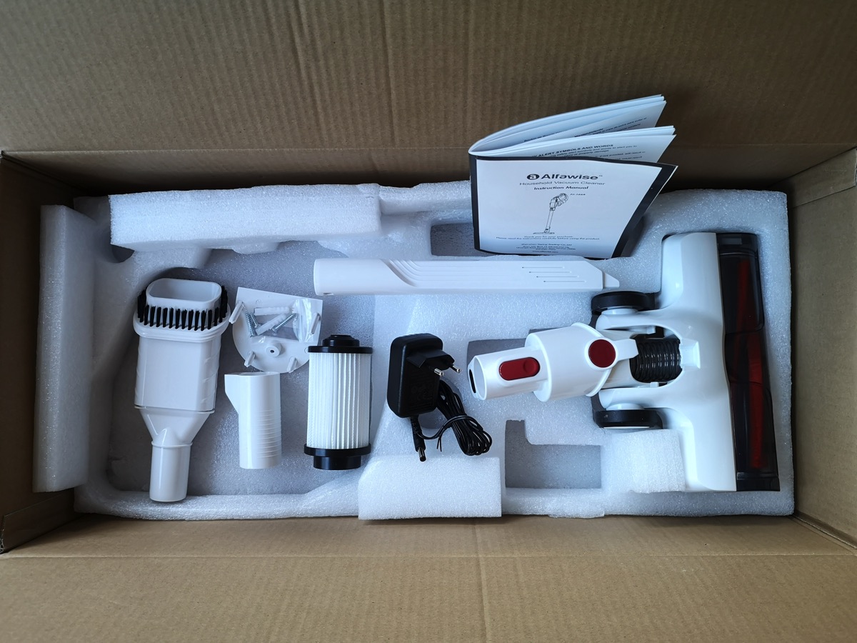 La scatola in cartone contiene l’aspirapolvere con pochi fronzoli: in pratica troviamo l’aspirapolvere con le sue spazzole accessorie: quella base per tappeti e pavimenti non tanto larga (e senza i LED che fanno tanto “futuro”( uno becco standard lungo con estensione morbida (comodissimo per pulire la parte interna dei sedili auto) ed una spazzola corta con doppia funzione dotata di blocco setole retrattile più adatta per la pulizia di briciole o dell’auto: sarà da utilizzare senza il tubo lungo per avere un’ottima capacità di aspirazione. Il tubo lungo con finitura alluminio aggiunge un tocco di eleganza ad un apparecchio che non appare poi così “economico”.
