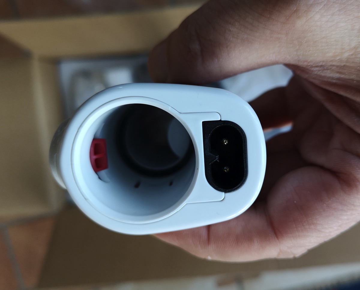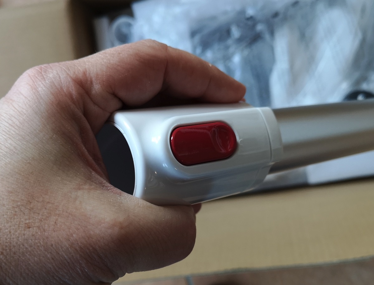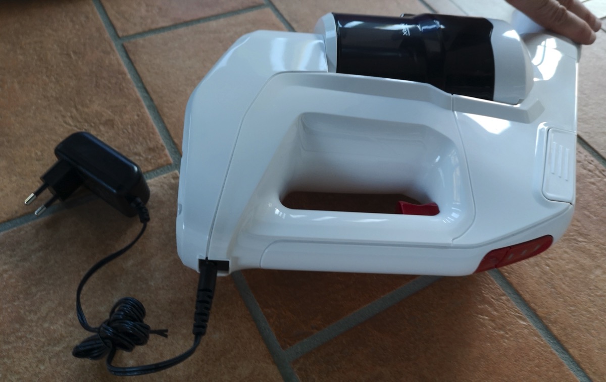 Sul retro, proprio sopra il grande “maniglione” che serve per utilizzzarlo grazie alla pressione del “grilletto” interno di colore rosso troviamo il pulsante che regola la potenza (I e II) e 3 bei led azzurri che ci riportano lo stato di carica dell’aspiraplovere sia in fase d’uso che in fase di ricarica.