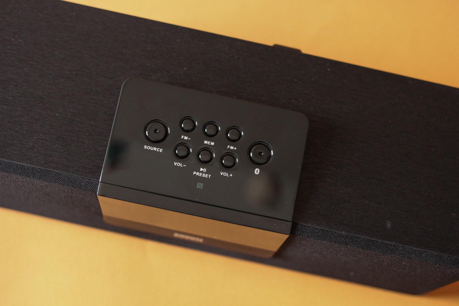 La superficie frontale è rivestita da stoffa traforata di ottima fattura che copre i due speaker da 15 W integrati: centralmente troviamo il display che, oltre a mostrare l’ora, sarà utile per gestire le varie modalità di riproduzione consentite. Per finire, sulla superficie superiore troviamo diversi pulsanti per il cambio di modalità e la gestione di volume, stazioni radio e riproduzione musicale.