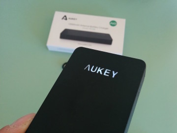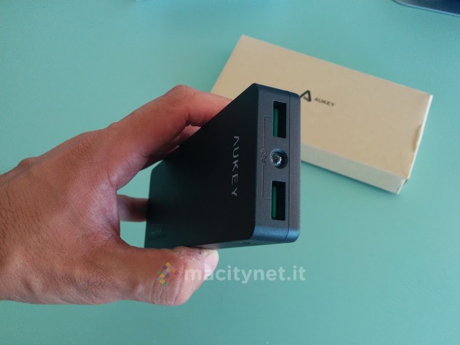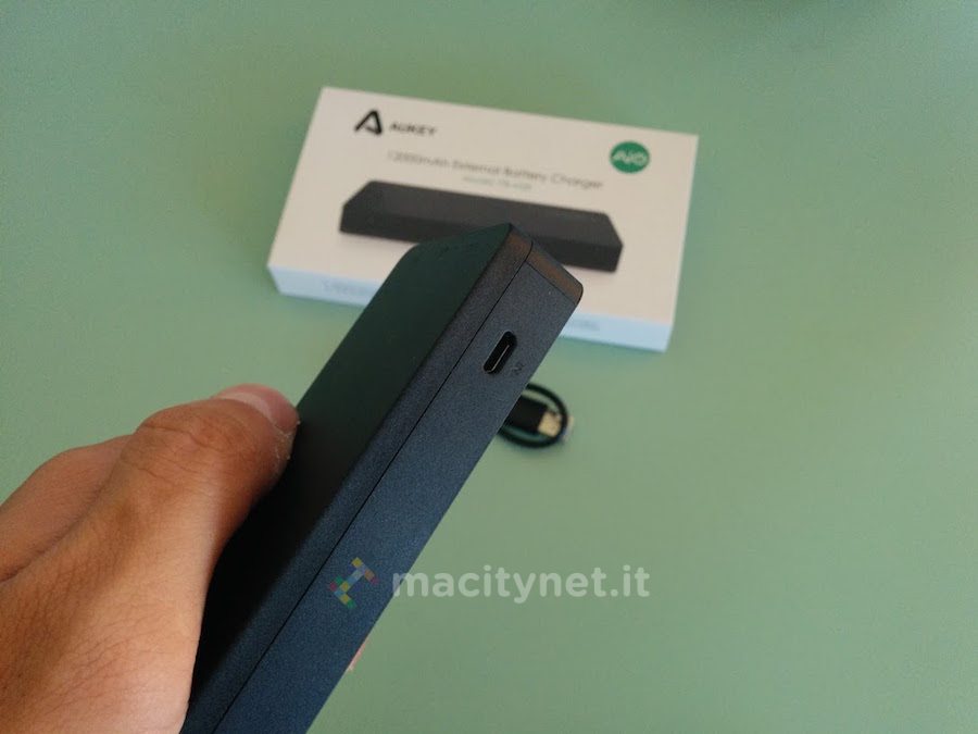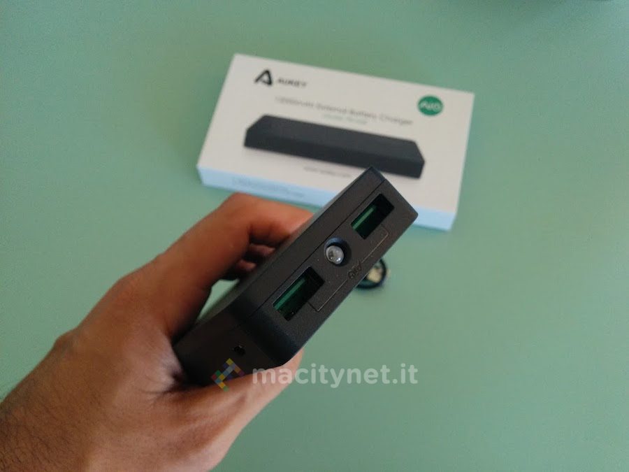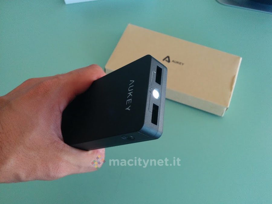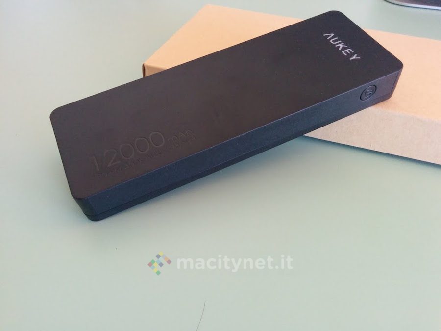 Sulla parte frontale è anche incisa la potenza nominale della batteria, pari a 12000 mAh, mentre sulla parte superiore sono presenti i due ingressi USB. Questi, come sempre da tradizione Aukey, risultano dotati di tecnologia AIPower, che riconosce automaticamente il dispositivo collegato, erogando automaticamente la potenza massima, fino a 2,4A, e comunque con il limite di 3,4A quando collegati due dispositivi contemporaneamente. In questo modo, non ci si dovrà preoccupare di collegare i tablet in una porta e gli smartphone nell’altra, potendo benissimo utilizzare l’una o l’altra indifferentemente. Altro elemento di pratica utilità è il LED bianco incluso tra i due ingressi USB, che permettono di trasformare la batteria in una potente torcia; non è l’utilizzo primario, ma risulta particolarmente utile in determinate condizioni di scarsa luce.