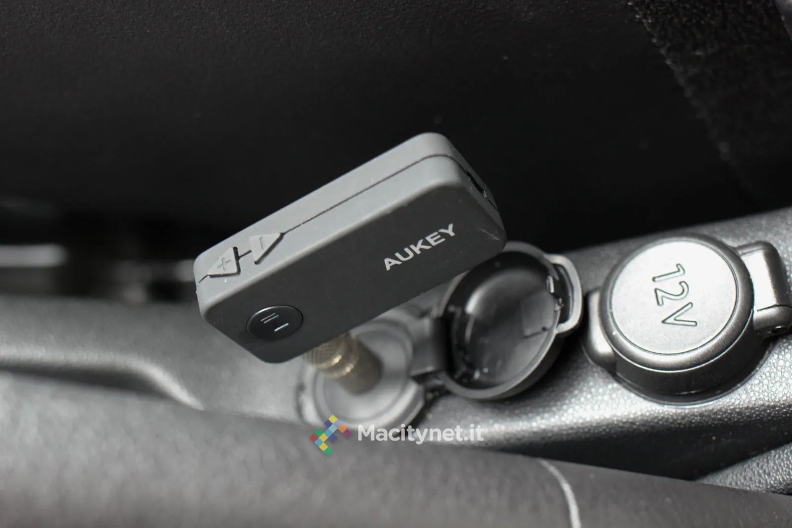 A questo punto è sufficiente mantenere la pressione sul tasto Multifunzione per qualche secondo per accendere il dispositivo: la luce LED che prima era rossa, lampeggerà costantemente di blu, simbolo che è in modalità “accoppiamento”. Basterà cercare la sigla del dispositivo tra quelli visibili dalla lista su iPhone per abbinare il telefono in pochi secondi al ricevitore: al termine dell’operazione, la luce blu sarà costantemente accesa e non resterà altro da fare che collegare il cavo jack o il più piccolo connettore all’Aukey, collegandolo successivamente all’ingresso AUX di un vecchio stereo, dell’autoradio o qualsiasi speaker dotato di tale porta.