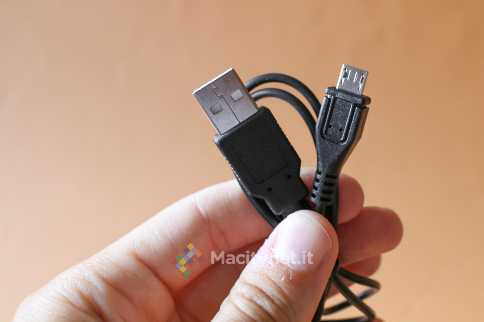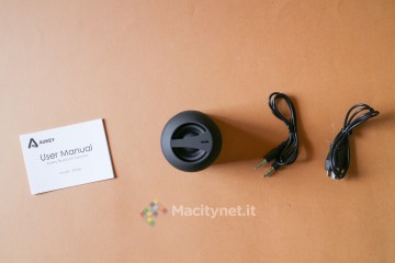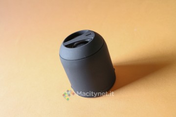 Custodito all’interno di una piccola scatola in cartone insieme al cavo microUSB per la ricarica, ad un cavo jack-jack da 3,5 mm per il collegamento aux ed al manuale utente, l’altoparlante si presenta in un unico pezzo che lontanamente ricorda, per la particolare forma, un Mac Pro in miniatura. Pesa all’incirca 140 grammi, è alto 7 centimetri e la base ha un diametro di 6 centimetri, è quindi uno di quei piccoli altoparlanti che potete tranquillamente dimenticare nella borsa, nello zaino o nella tasca del giubotto. Tutta la struttura è in plastica di ottima qualità, con una copertura gommata che riduce il depositarsi delle ditate e ne aumenta l’aderenza nel caso lo si maneggi con le mani sudate.