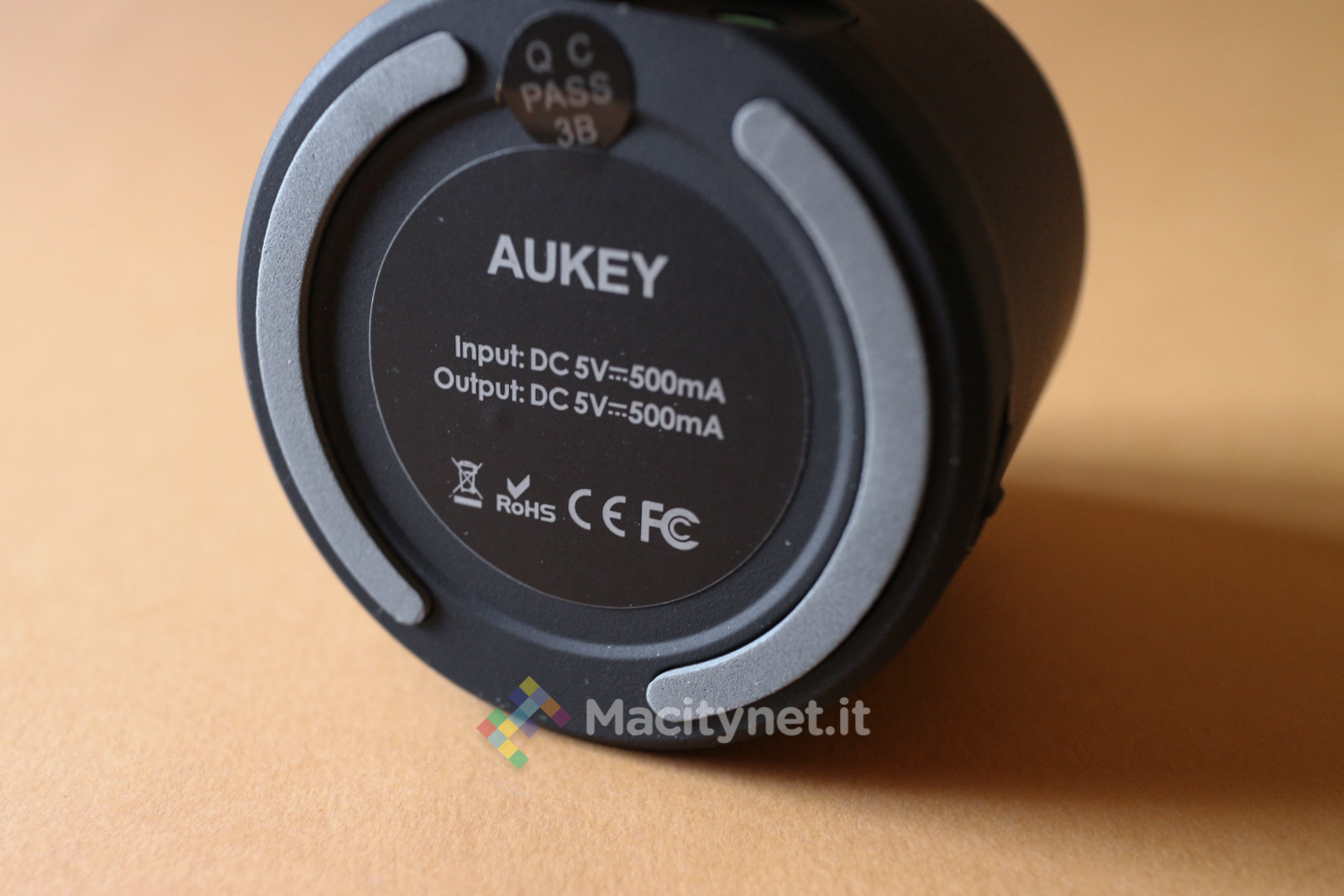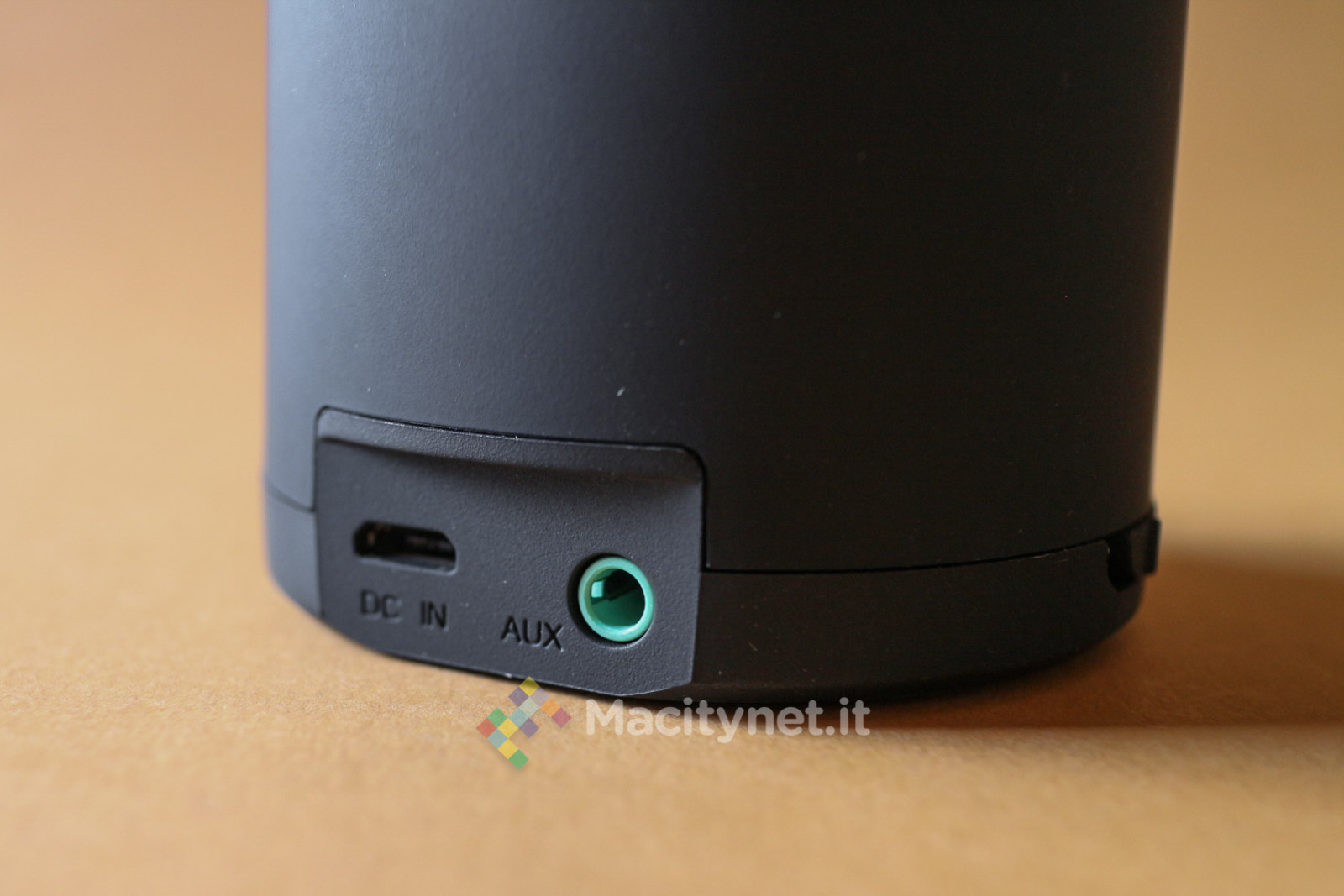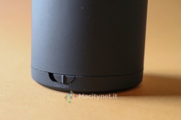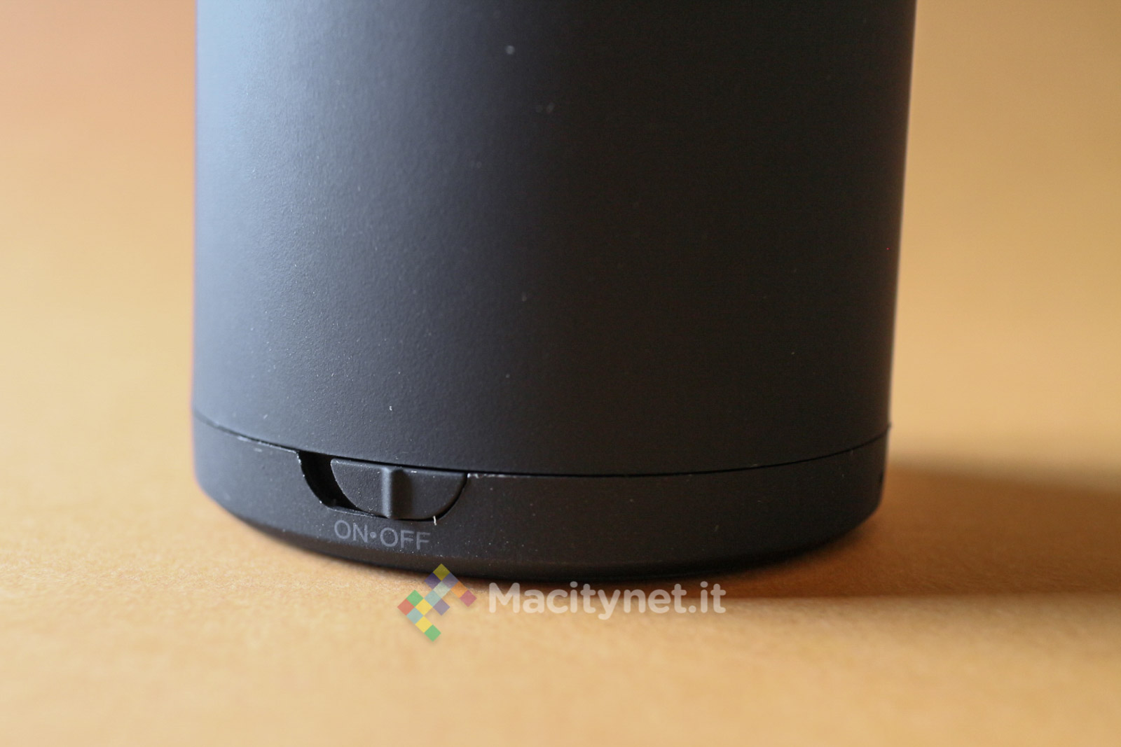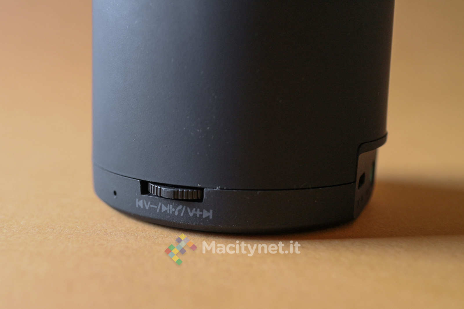 I tasti e gli ingressi sono ridotti all’osso e si trovano tutti sulla parte bassa del piccolo cilindro. Da un lato troviamo ingresso microUSB e jack rispettivamente per ricarica e collegamento via cavo, dal lato opposto un piccolo foro che protegge il LED che segnala accensione (blu), collegamento Bluetooth (blu lampeggiante) e batteria scarica (in rosso). Alla stessa altezza troviamo da un lato l’interruttore ON/OFF per accendere e spegnere la cassa, dall’altro una rotella – vicino ad un foro che permette il funzionamento del microfono incorporato – utile per controllare le principali funzioni dell’altoparlante senza interagire con il telefono. E’ caratterizzata da un sistema “a molla” che riporta sempre il pin centrale alla posizione di partenza: spostandola a sinistra o destra con un rapido tocco si può saltare traccia o tornare a quella precedente, con la pressione prolungata si regola invece il volume. Oltre a spostarsi lateralmente può anche essere premuta, permettendo così di avviare e fermare la riproduzione musicale : la pressione prolungata disconnette e ricollega il dispositivo al telefono tramite Bluetooth. Gli stessi click singolo e prolungato permettono, con una chiamata in entrata, di rispondere e riagganciare. In pratica, si fa tutto da un solo pulsante, una scelta che rende la cassa facile da utilizzare fin dalla prima accensione. I controlli infatti risultano fin da subito molto intuitivi, facendosi apprezzare soprattutto nella regolazione del volume che ci è sembrata più immediata rispetto al classico pulsante da pigiare.